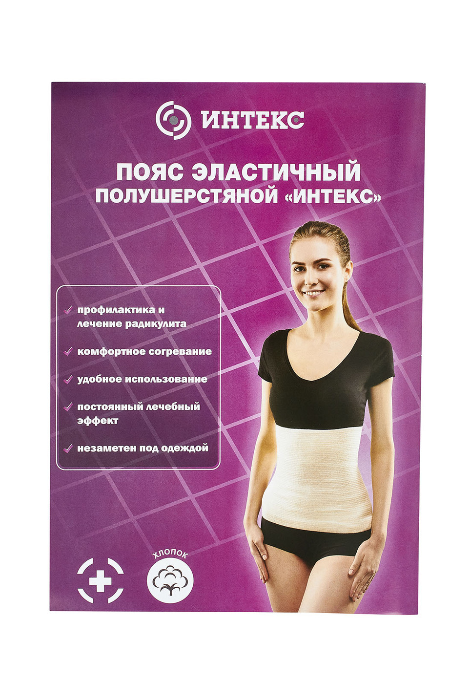 Согревающий пояс «ИНТЕКС» изготовлен из нитей с добавлением натуральной овечьей шерсти.Такой состав материала с одной стороны оказывает прогревающий и массажный эффекты благодаря содержанию натуральной шерсти, с другой стороны, другие компоненты нитей обе