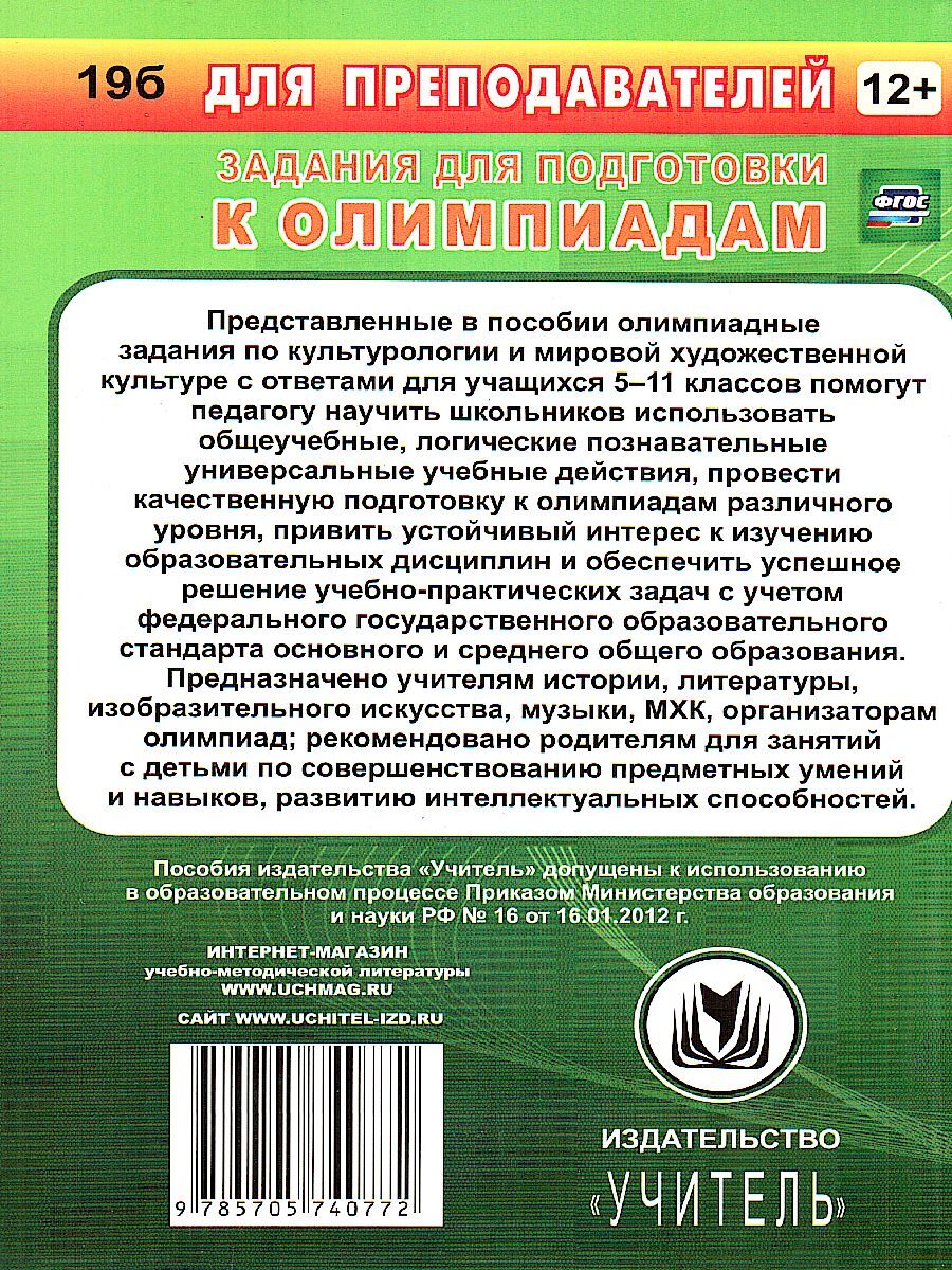 Представленные в пособии олимпиадные задания по культурологии и мировой художественной культуре с ответами для учащихся 5-11 классов помогут педагогу научить школьников использовать общеучебные, логические познавательные универсальные учебные действия, пр