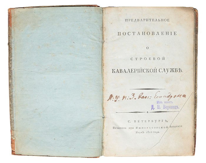 Санкт-Петербург, 1812 год. Издание Императорской Академии наук. Владельческий переплет. Сохранность хорошая. В 1812 году вышел было издано «Предварительное постановление о строевой кавалерийской службе», ставшее впоследствии основой нового воинского
