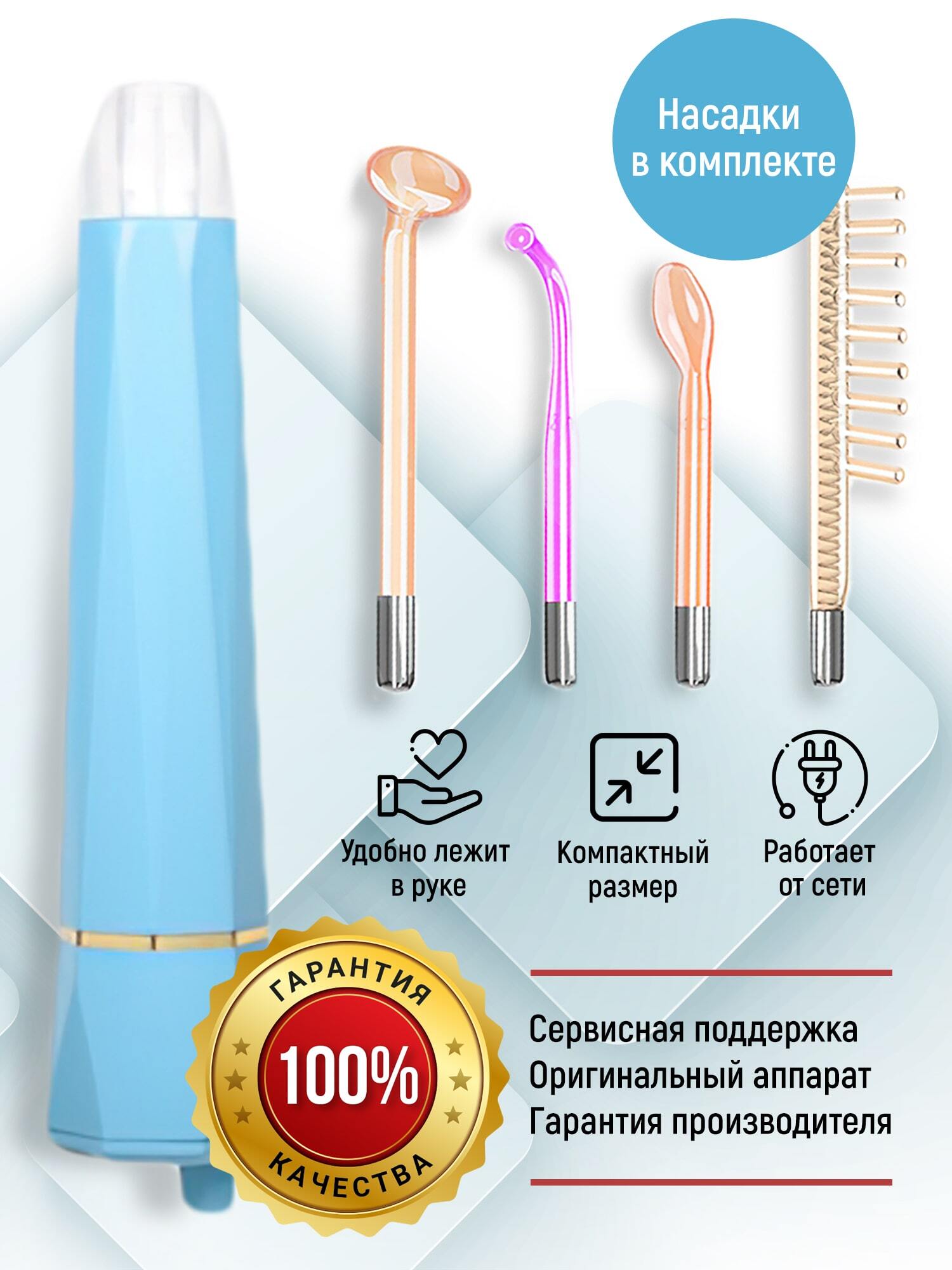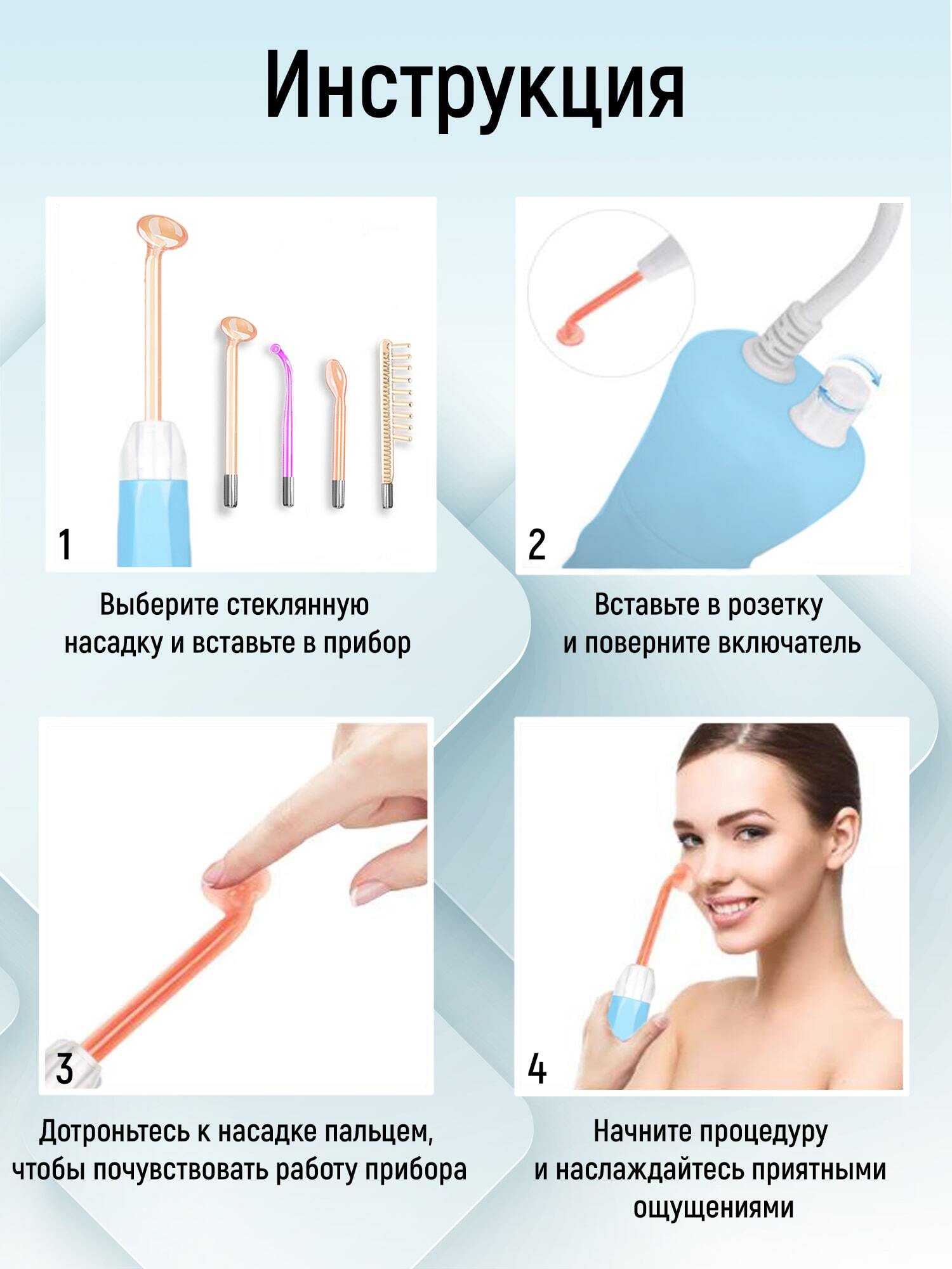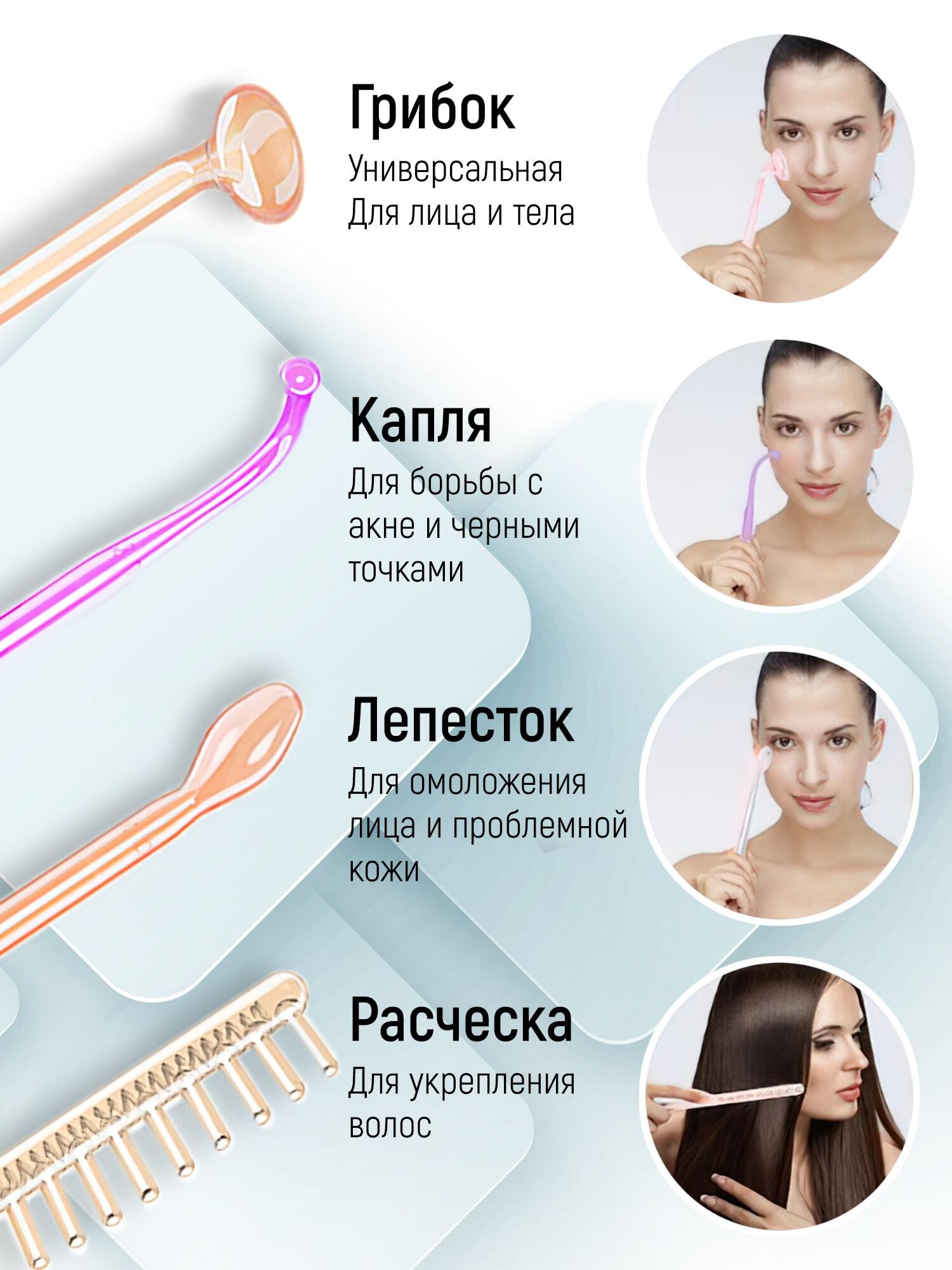 Насадки:Грибок Каля Лепесток РасческаКомплектация:1) Дарсонваль2) 4 насадки: - Грибок - Каля -Лепесток -Расческа3) Инструкция
