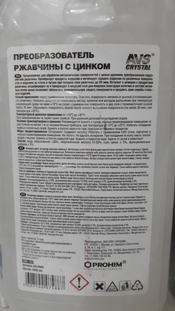 Комплектация:Преобразователь ржавчины с цинком Цинкач (антиржавчина) триггер 500 мл. AVS AVK-181 A07077S - 1 шт.Преобразователь ржавчины с цинком Цинкач (антиржавчина) тюбик 60 мл. AVS AVK-190 A07595S - 1шт.Описание:С проблемой образования очагов коррозии