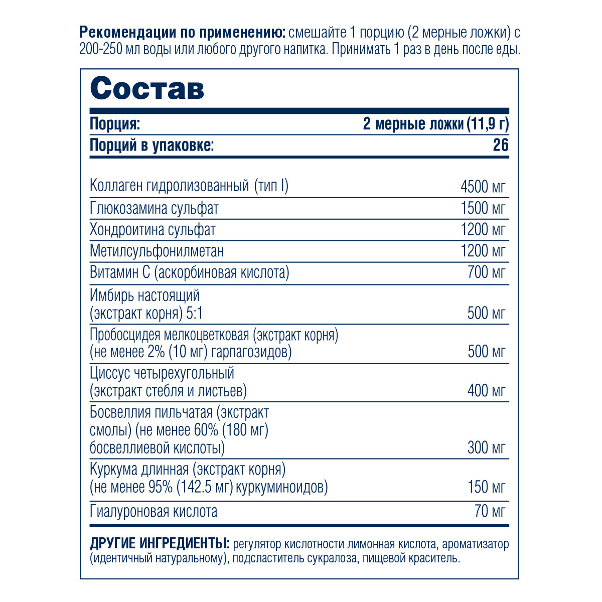 СоставСостав на одну порцию (2 мерные ложки - 11,9 гр.): Коллаген гидролизованный свиной (тип I) - 4500 мг, Глюкозамина сульфат - 1500 мг, Хондроитина сульфат - 1200 мг, Метилсульфонилметан (МСМ) - 1200 мг, Витамин С (аскорбиновая кислота) - 700 мг, Имбирь наст