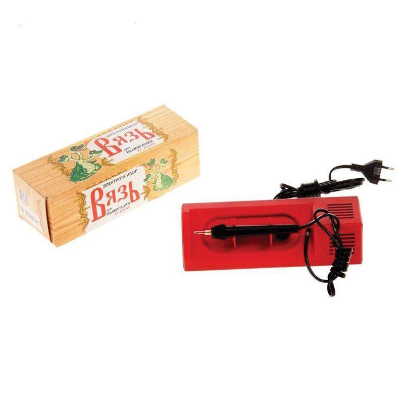 Электроприбор состоит из пластмассового корпуса, понижающего трансформатора, регулятора накала иглы, карандаша со сменными иглами (выжигания по дереву).