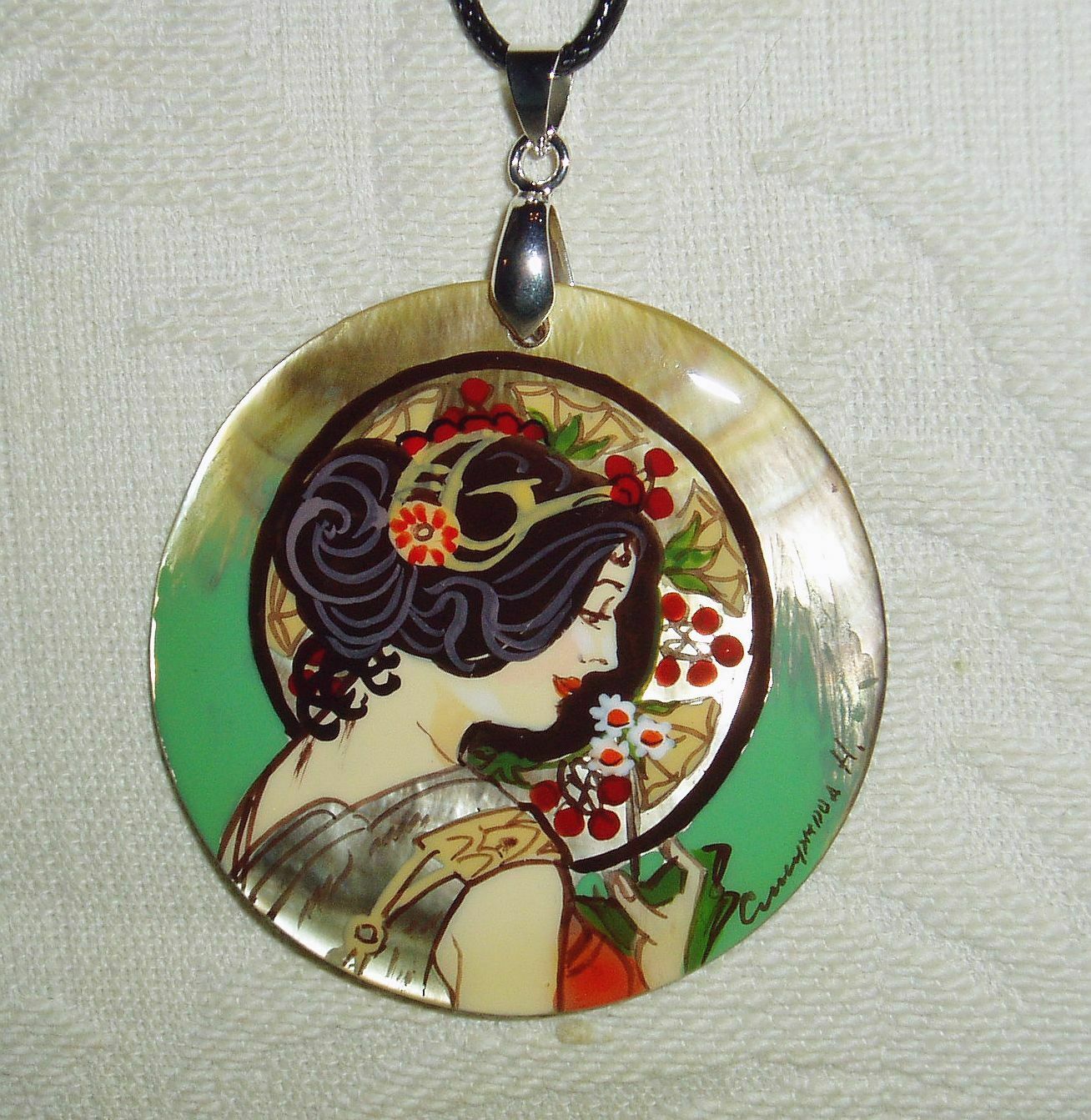 Примула". По мотивам картины А. Мухи.Лаковая подвеска с росписью на перламутровой пластине с деталями из металлического сплава. Так как материал для кулона - часть натуральной морской раковины, то перламутровая пластина имеет неровности.Размеры: диаметр 5