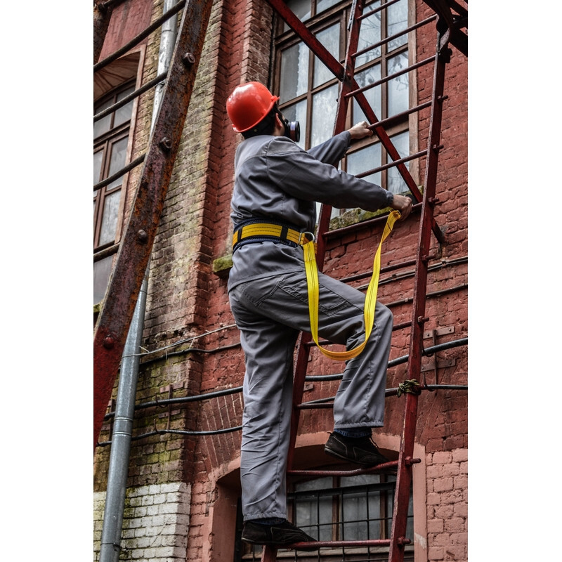 Привязь удерживающая включает в себя ремень с пряжкой (позволяет подгонять пояс по фигуре человека), подкладку под ремень (кушак), элементы крепления - два металлические D-кольца на ремне привязи, строп из полиамидной ленты с монтажным карабином (4 типа к