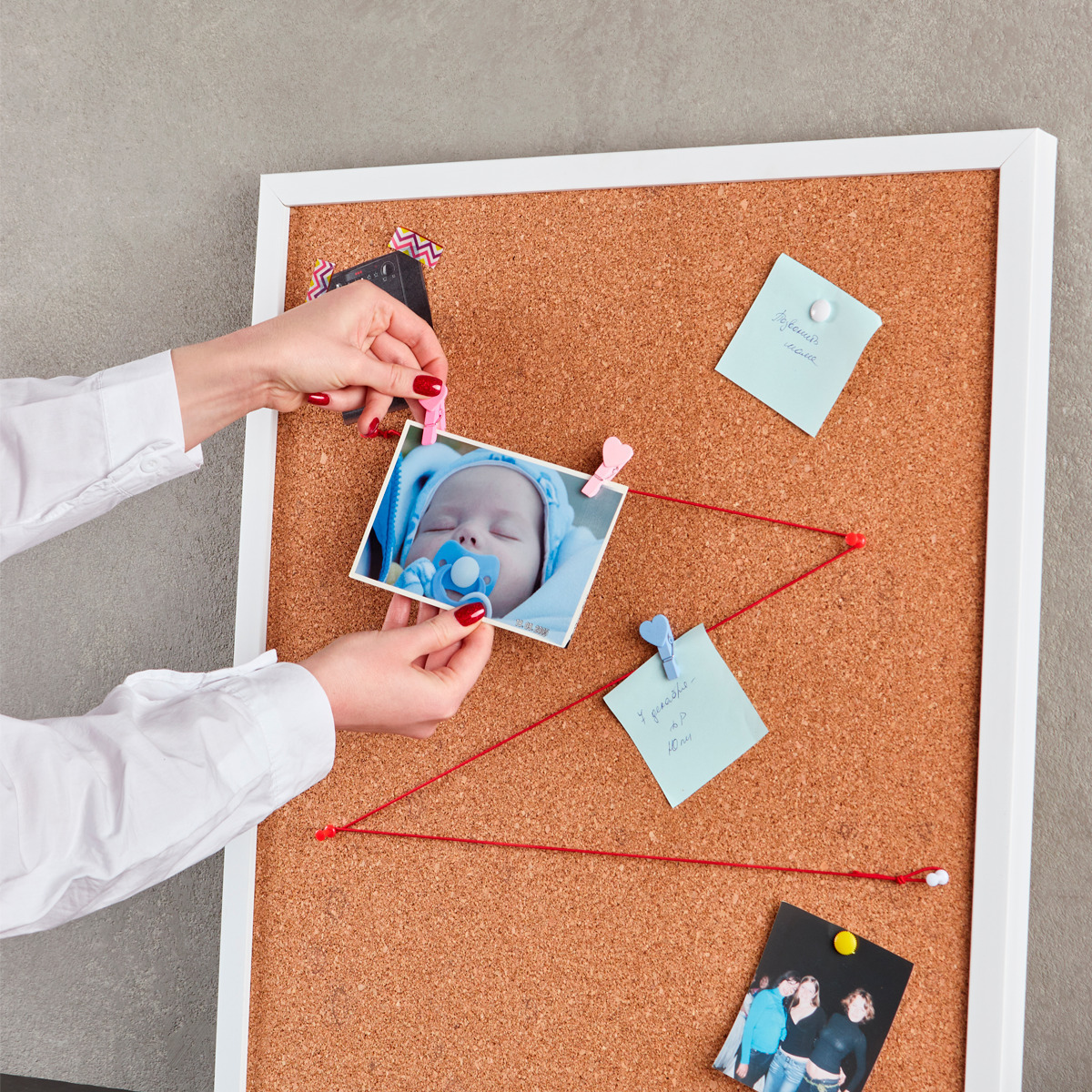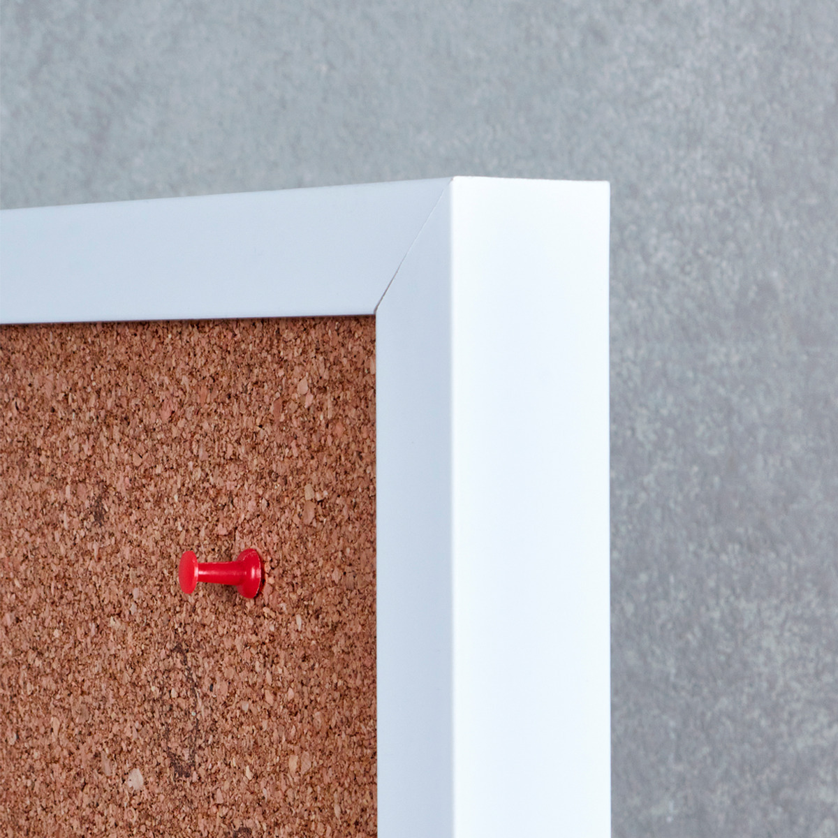 Пробковая доска среднего размера в Белой рамке, имеет одинаковую толщину по всей поверхности 21мм , что обеспечивает плотное прилегание доски к стене по всей поверхности, и кнопки не будут портить стену.Крепится к стене на 2 самореза и цепляется за крючки