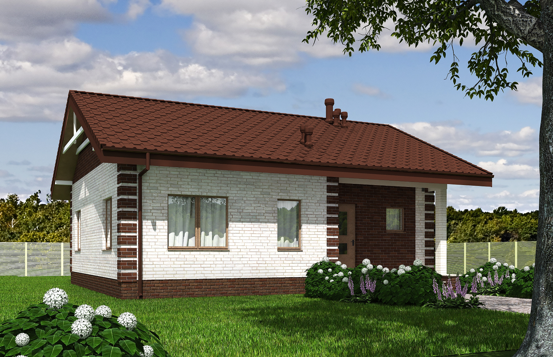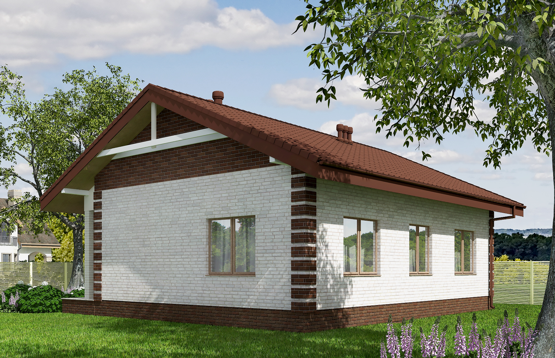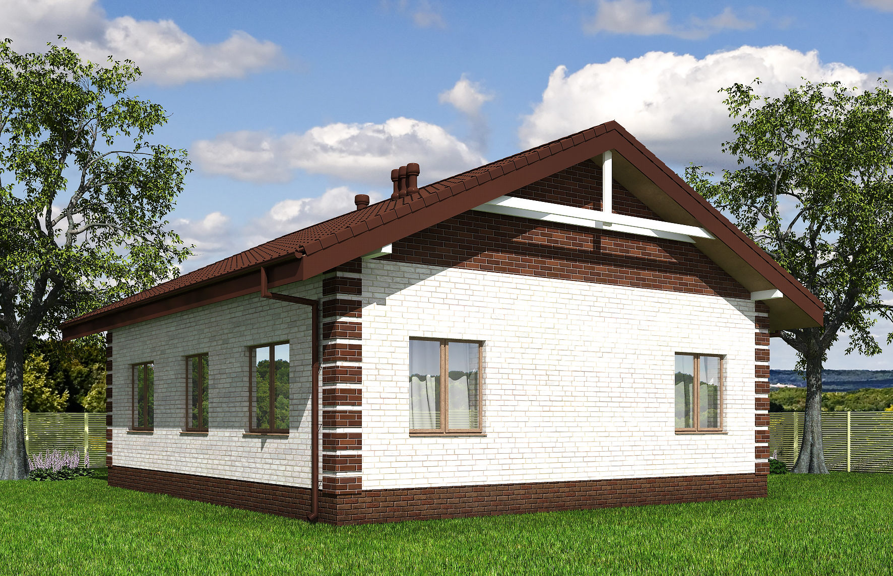 Одноэтажный жилой дом с размерами здания 9,22 м х 10,72 м. Фундамент - ленточный монолитный ж/б под несущими стенами. Наружные стены - газобетонные блоки с утеплением минеральной ватой и отделкой облицовочным кирпичом. Пол этажа - сборные ж/б плиты. Черда