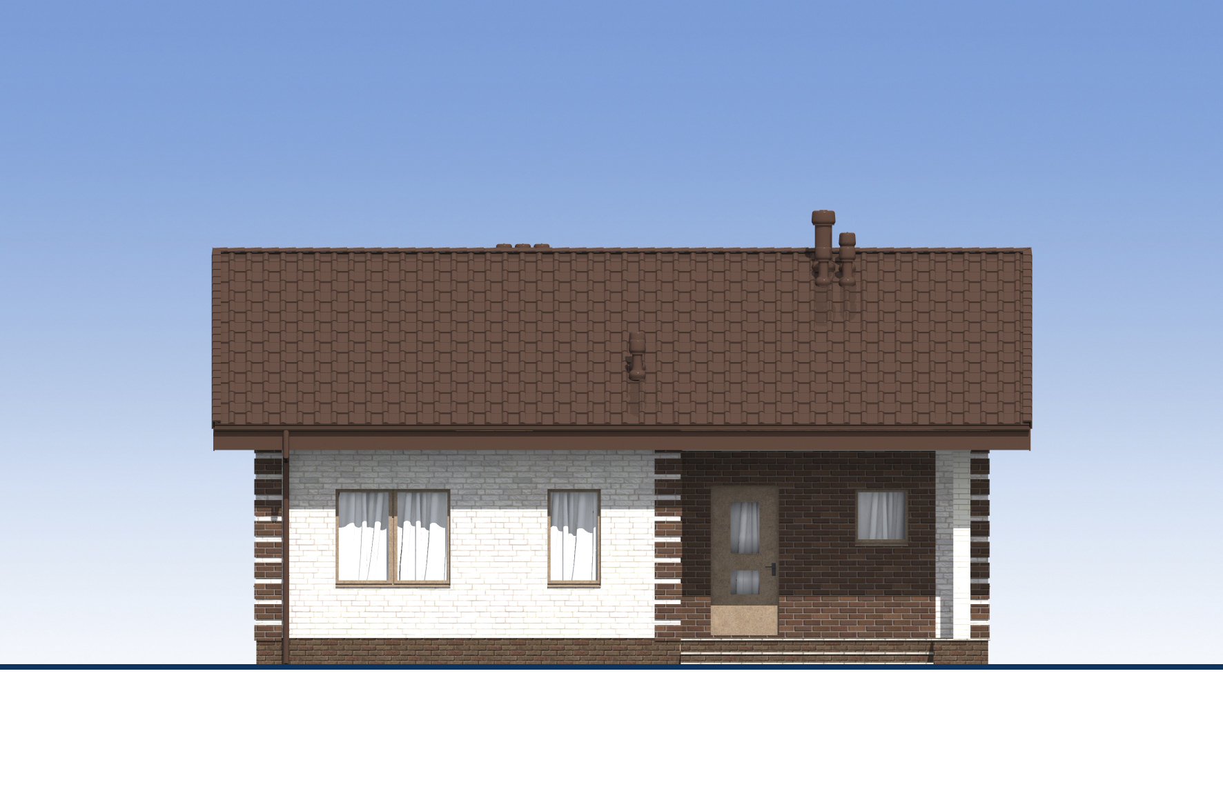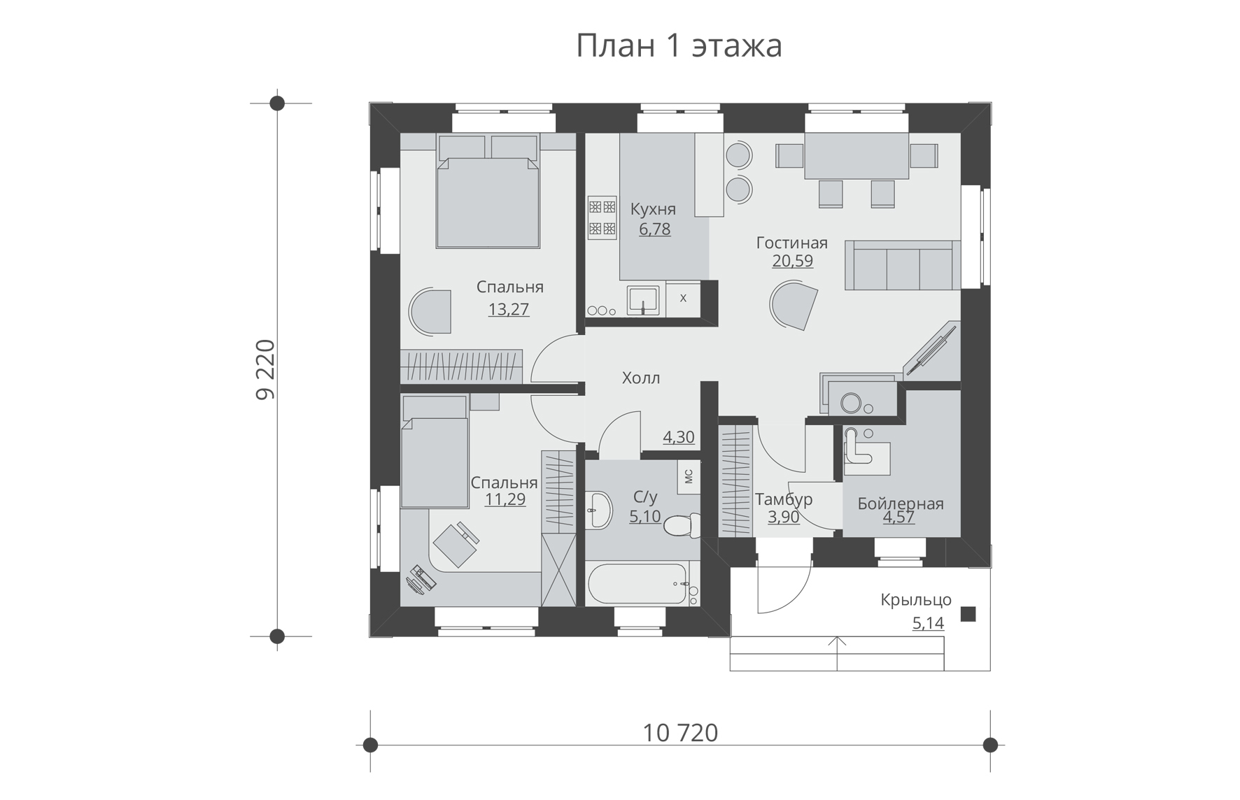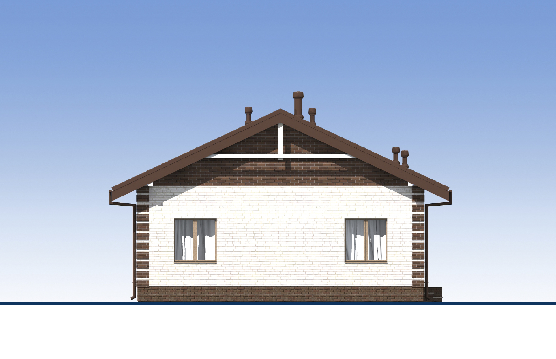 Одноэтажный жилой дом с размерами здания 9,22 м х 10,72 м. Фундамент - ленточный монолитный ж/б под несущими стенами. Наружные стены - газобетонные блоки с утеплением минеральной ватой и отделкой облицовочным кирпичом. Пол этажа - сборные ж/б плиты. Черда