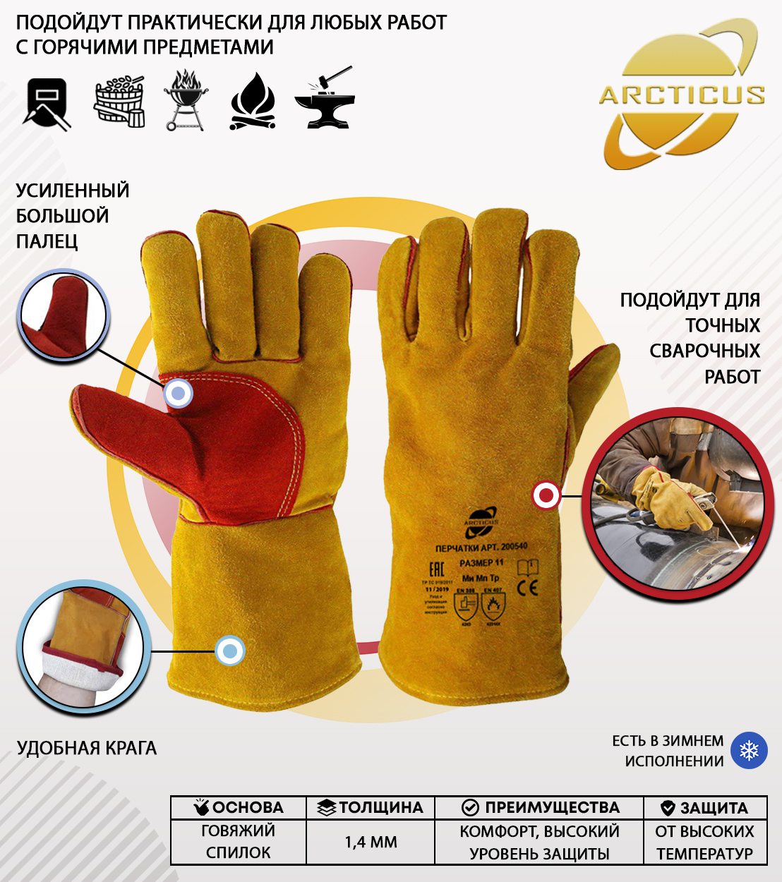 Arcticus 200540 - краги сварщика пятипалые с дополнительным усилением ладони и большого пальца. Изготовлены из бычьего спилка толщиной 1,2 - 1,4 мм класса А желтого цвета, прошиты кевларовой нитью. Двойные швы. Длина 35 см. Подкладка: в кистевой части вып