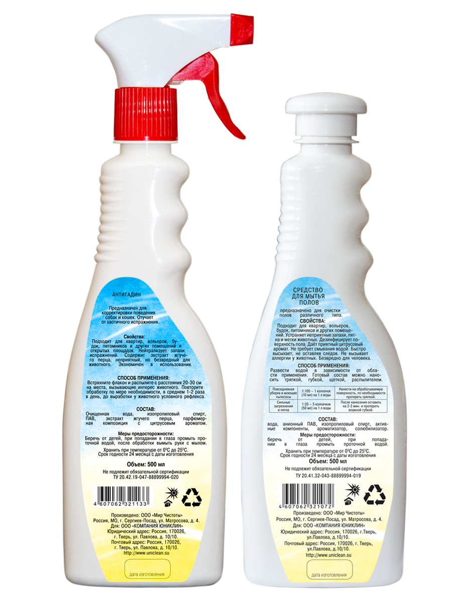 Комплектация:Спрей антигадин Uniclean 500 мл - 1 шт Средство для мытья полов Uniclean концентрат 500 мл - 1 штОписание:Промонабор 1. Спрей антигадин Uniclean 500 млПредназначен для корректировки поведения собак и кошек. Отучает от хаотичного испражнения.