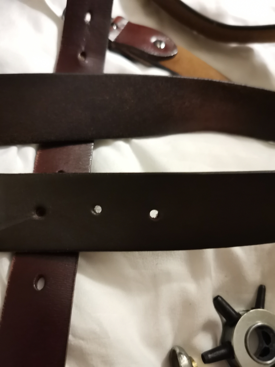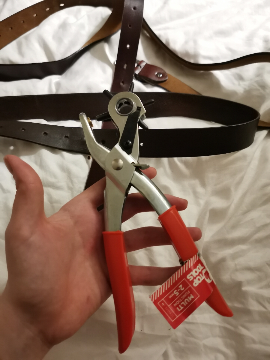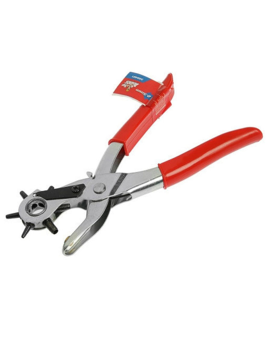 Дырокол для ремня выполнен в форме нажимных кусачек. Инструмент изготовлен из нержавеющей стали, ручки снабжены противоскользящими накладками. На регулирующемся колесе пробойника для кожи расположены металлические шипы, с помощью которых можно делать отве