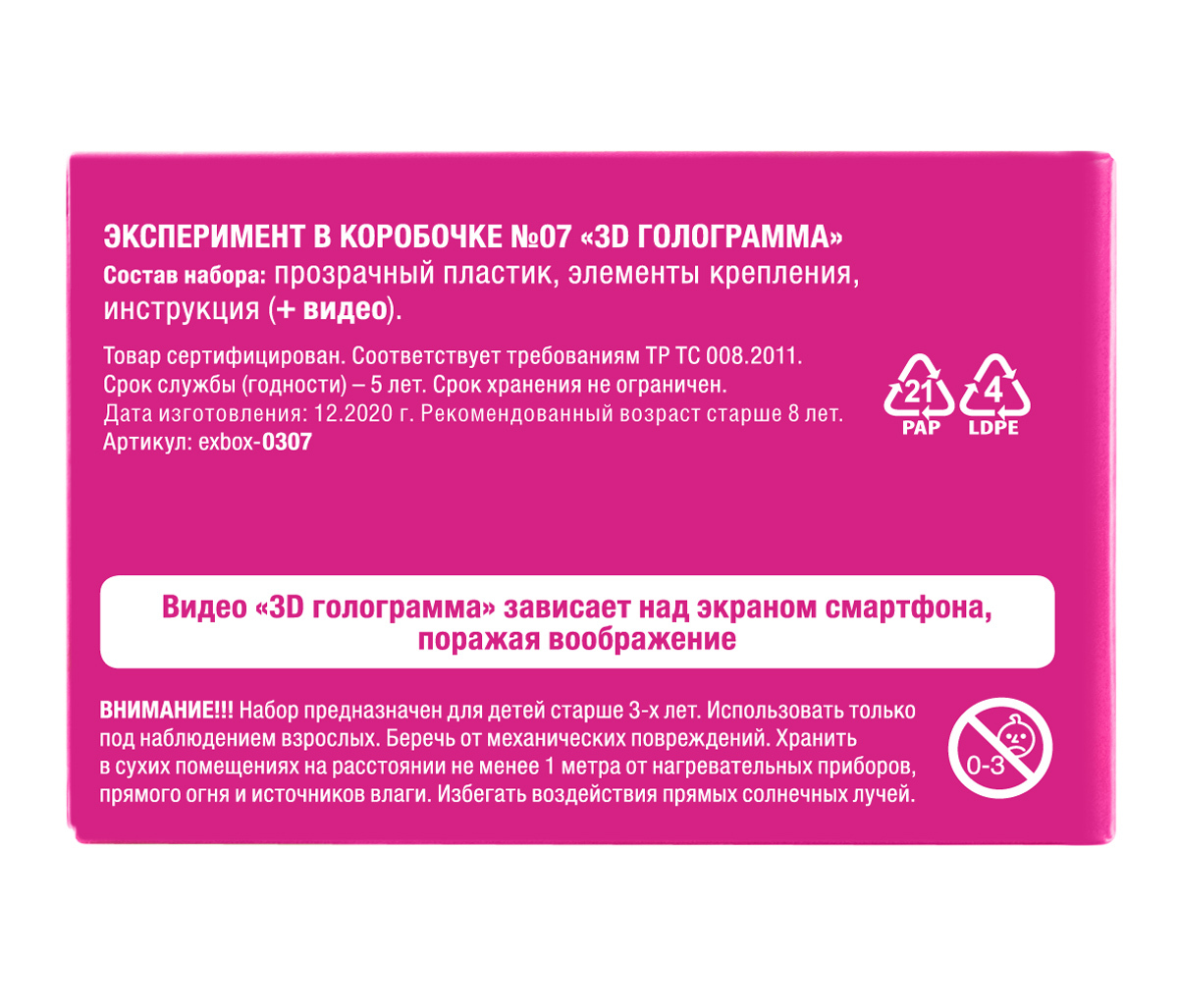 Комплектация:Трапеции прозрачные 4 шт., скотч прозрачныйОписание:Видео 3D-голограмма зависает над экраном смартфона и поражает воображение.Собранная пластиковая пирамида идет в наборе. Со смартфона заходим в интернет по ссылке, указанной в инструкции и за