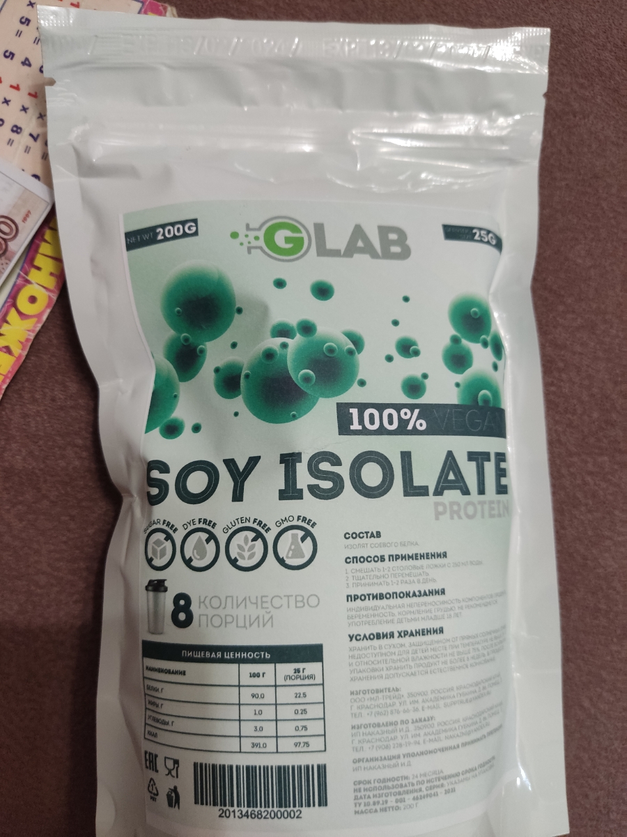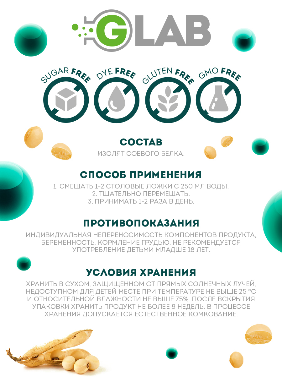 Продукт G-lab Soy protein содержит 100% соевый изолят полезная форма соевого белка с богатым аминокислотным профилем, в которой нет фитоэстрагенов. Соевый изолят ускоряет обмен веществ, способствуя снижению лишнего веса. Употребление изолята соевого проте