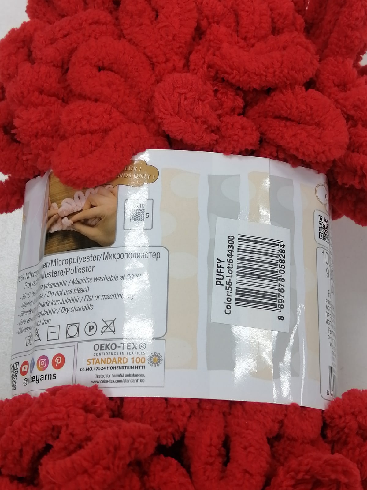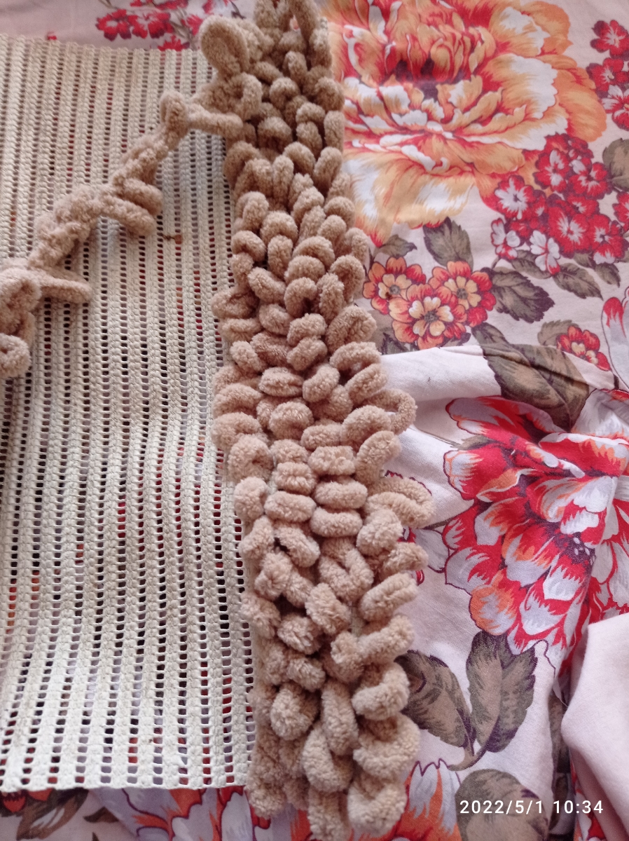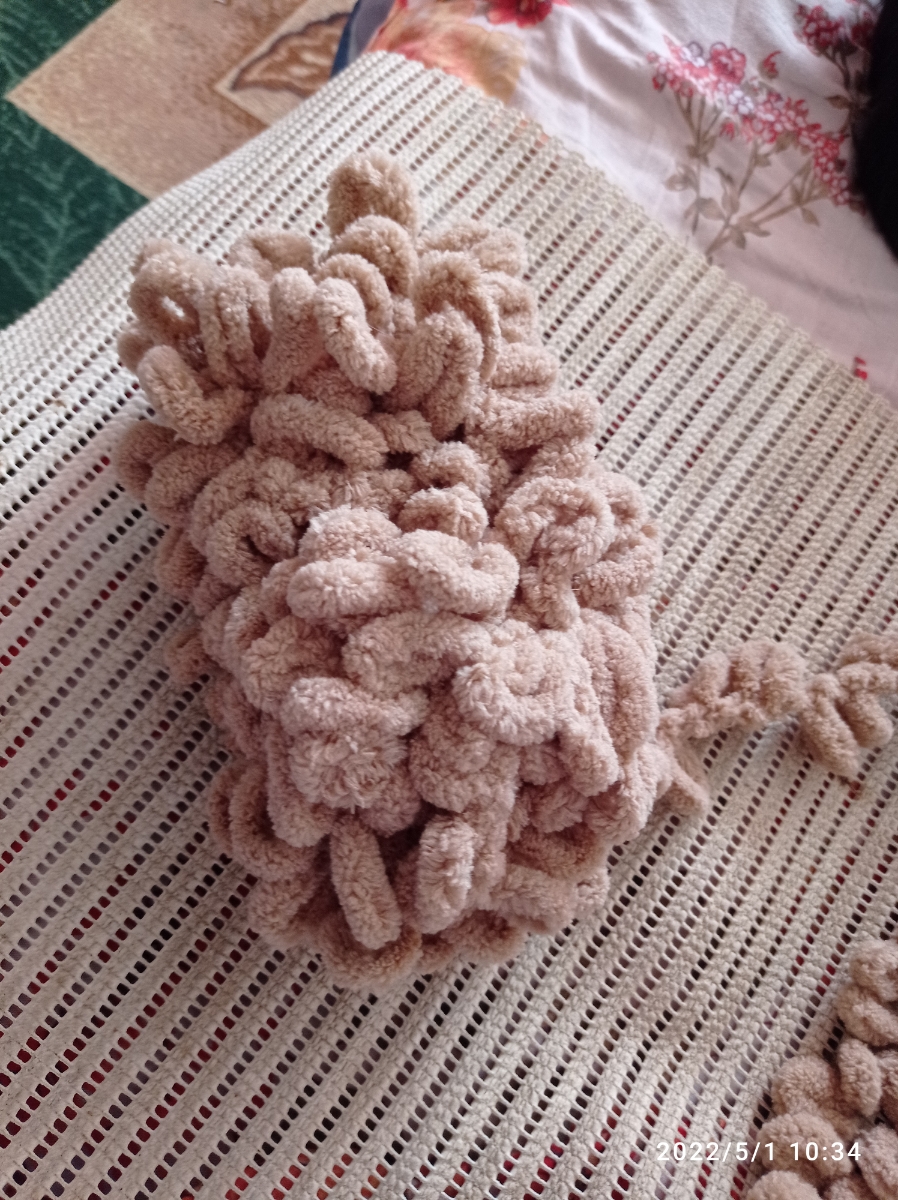 Состав: 100%микрополиэстер/Толстая плюшевая нить, в мотке 100 г всего 9 м. Представляет собой уже готовые петельки, высотой около 4 см, которые переплетаются в полотно без использования спиц. Провязывается руками путем продевания петли в петлю. Можно вяза