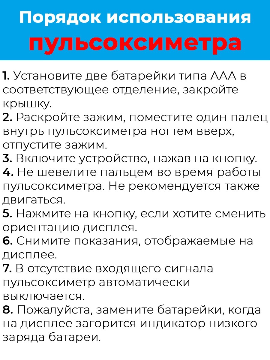 Комплектация:Пульсоксиметр медицинский , Батарейки ААА (2 шт.), ИнструкцияОписание:Батарейки в комплекте.Инструкцию на русском языке можно посмотреть в карточке товара Товар прошел обязательное декларирование соответствия Пульсоксиметр(измеритель кислород