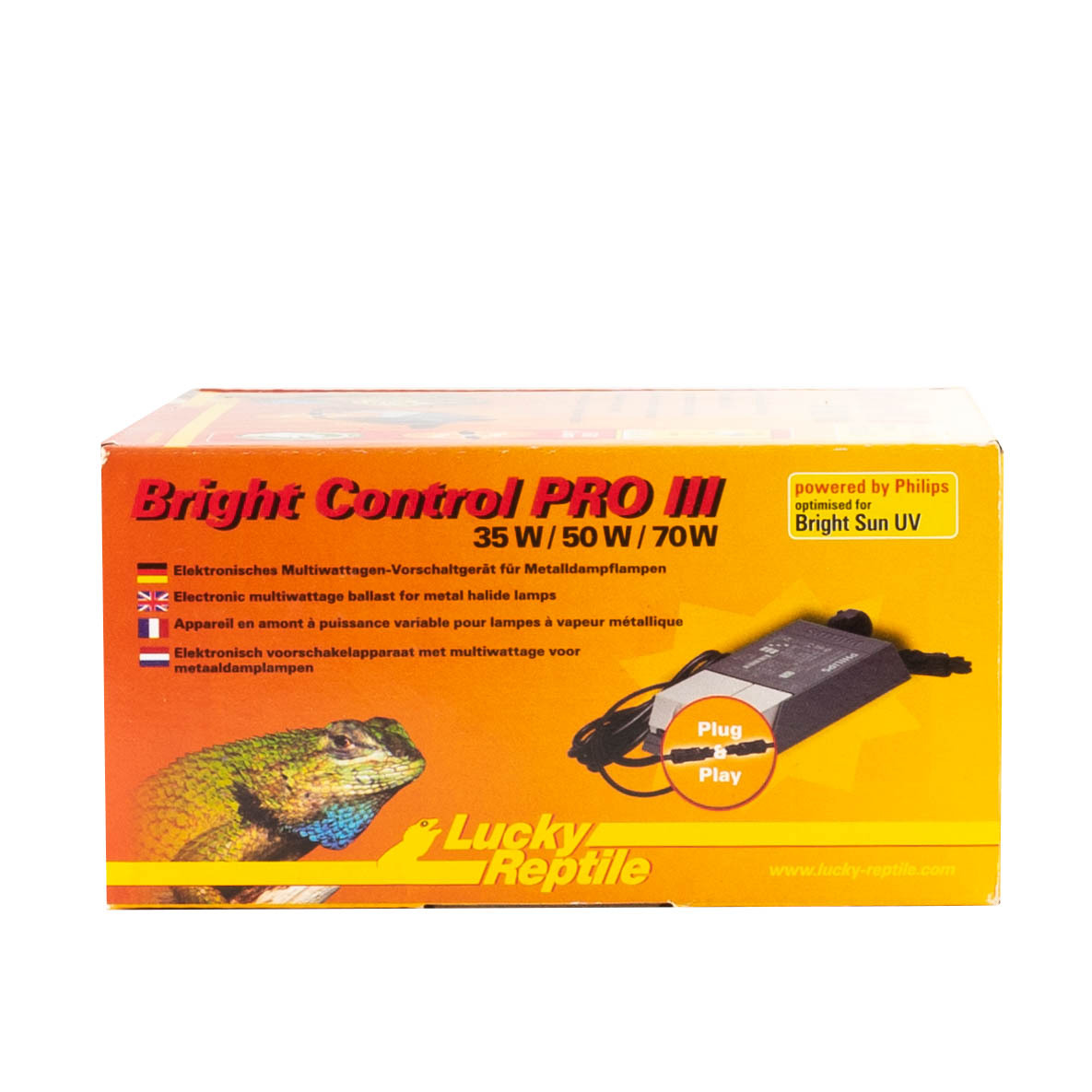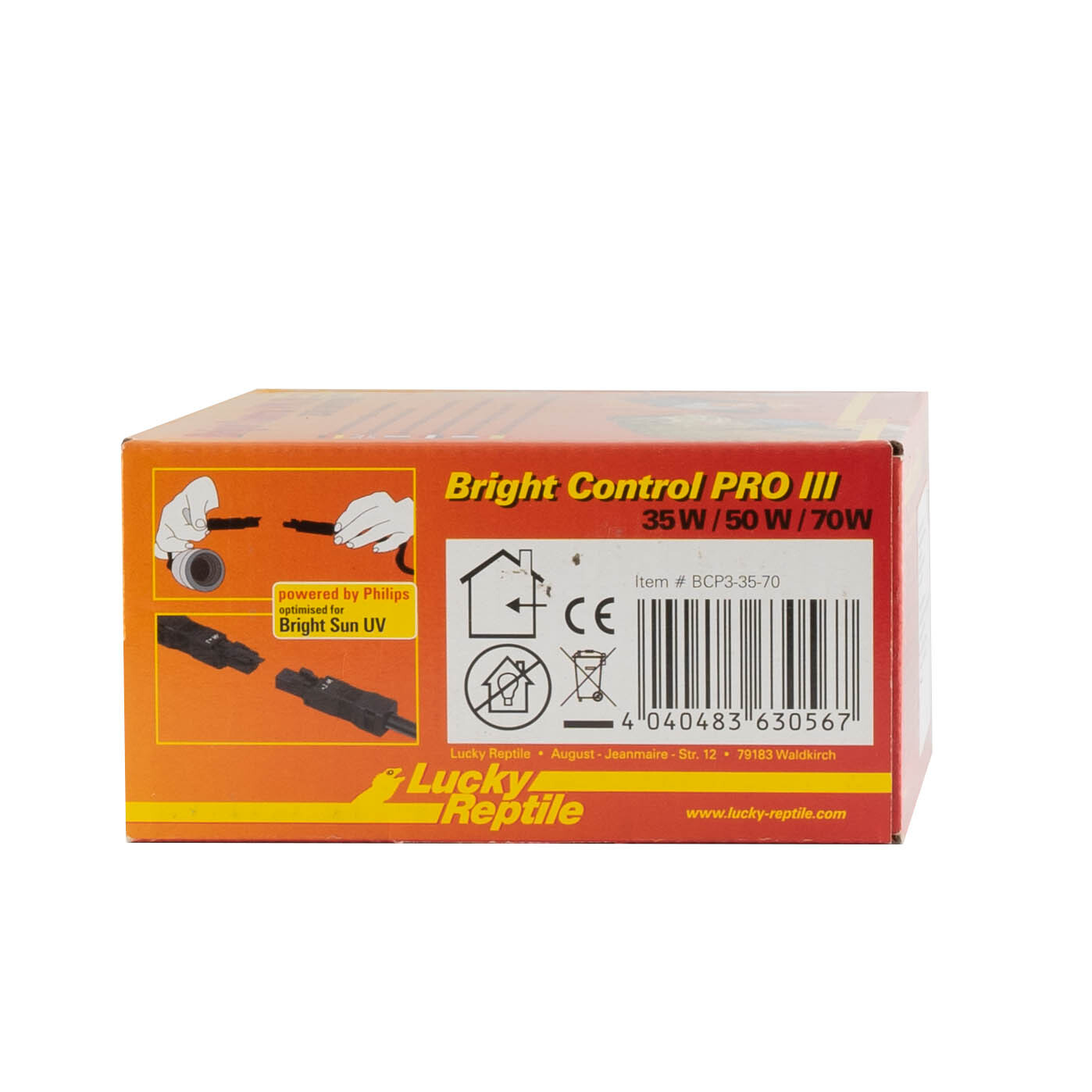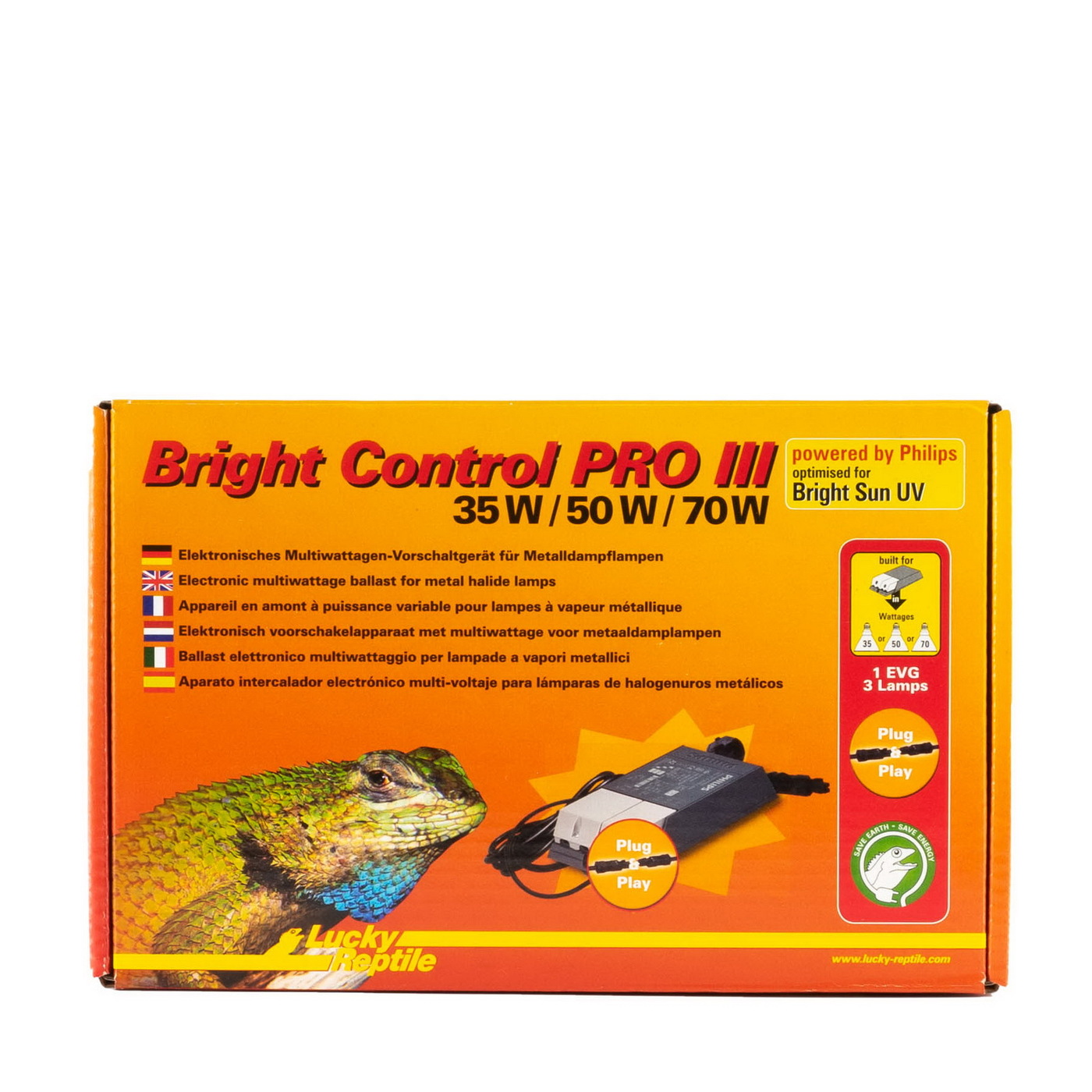 Пускорегулирующее устройство на 35 Вт, 50 Вт, 70 Вт (3 в 1).Bright Control PRO III является универсальным, и может работать вместе с ультрафиолетовыми лампами Lucky Reptile Bright Sun 35 Вт, 50 Вт или 70 Вт! Скользящий переключатель сбоку позволяет устано