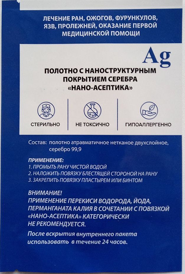 Комплектация:Полотно атравматическое, антимикробное нетканое двухслойное ; серебро 99,9%Описание:Ранозаживляющая повязка с серебром для лечения и предотвращения инфицирования ран ожогов и пролежней 15х15 см.Стерильно.Состав: Полотно атравматическое, антим