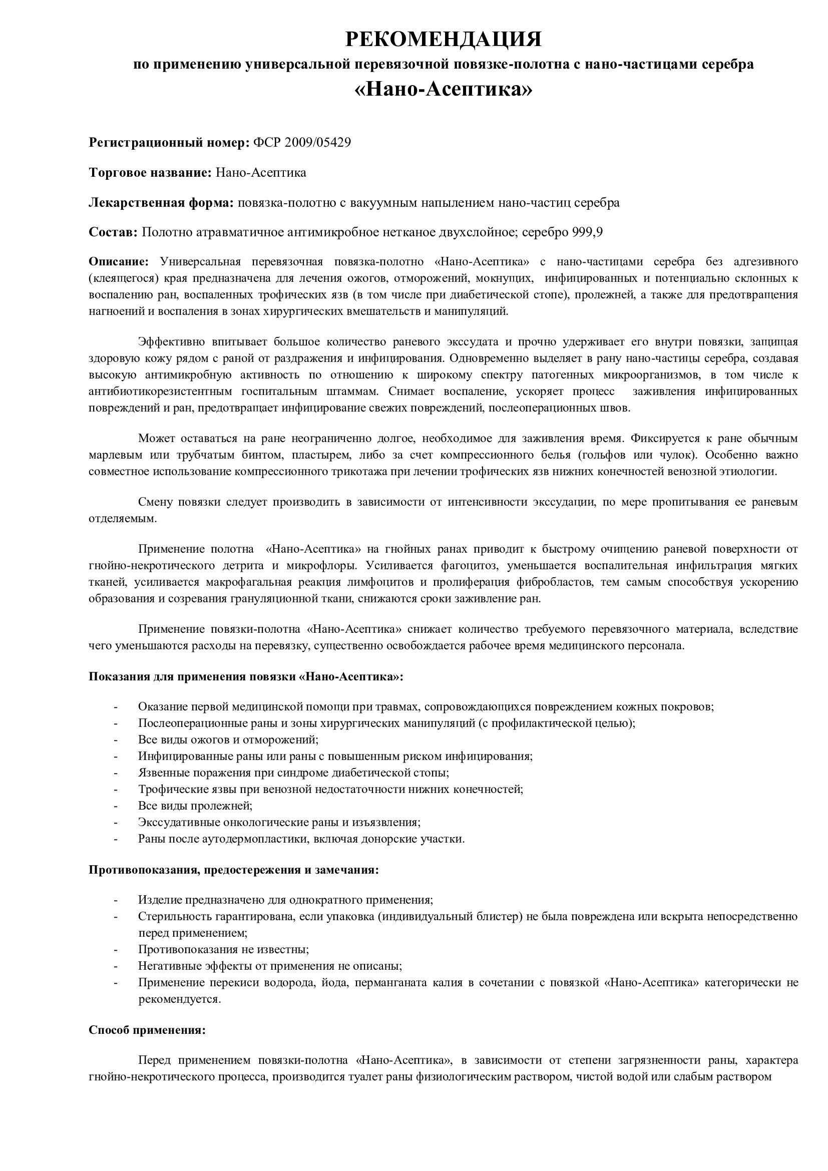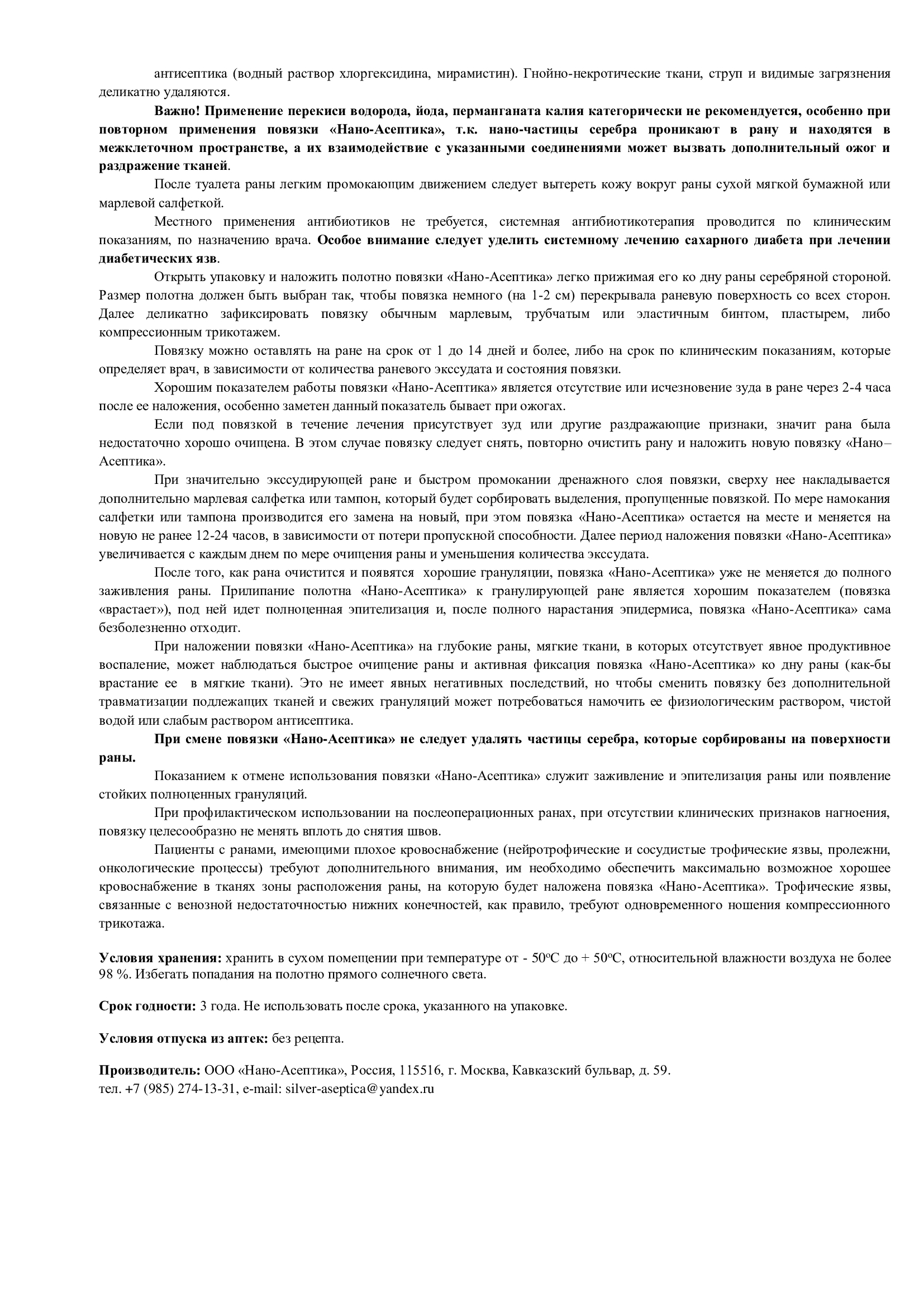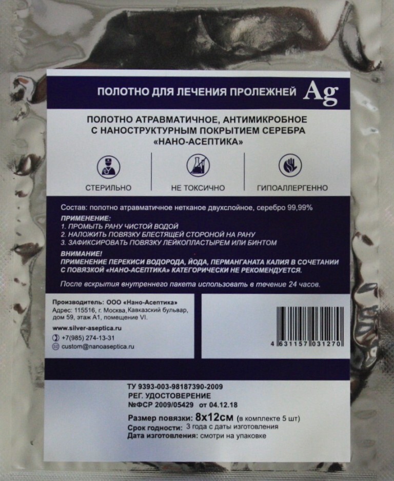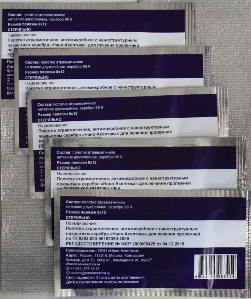 Комплектация:В комплект входит 5 штук повязок Полотно атравматичное, антимикробное с наноструктурным покрытием серебра 99,9% "НАНО-АСЕПТИКА", 8х12см.Описание:Предназначена для лечения ожогов, пролежней, отморожений, мокнущих, инфицированных и потенциальн