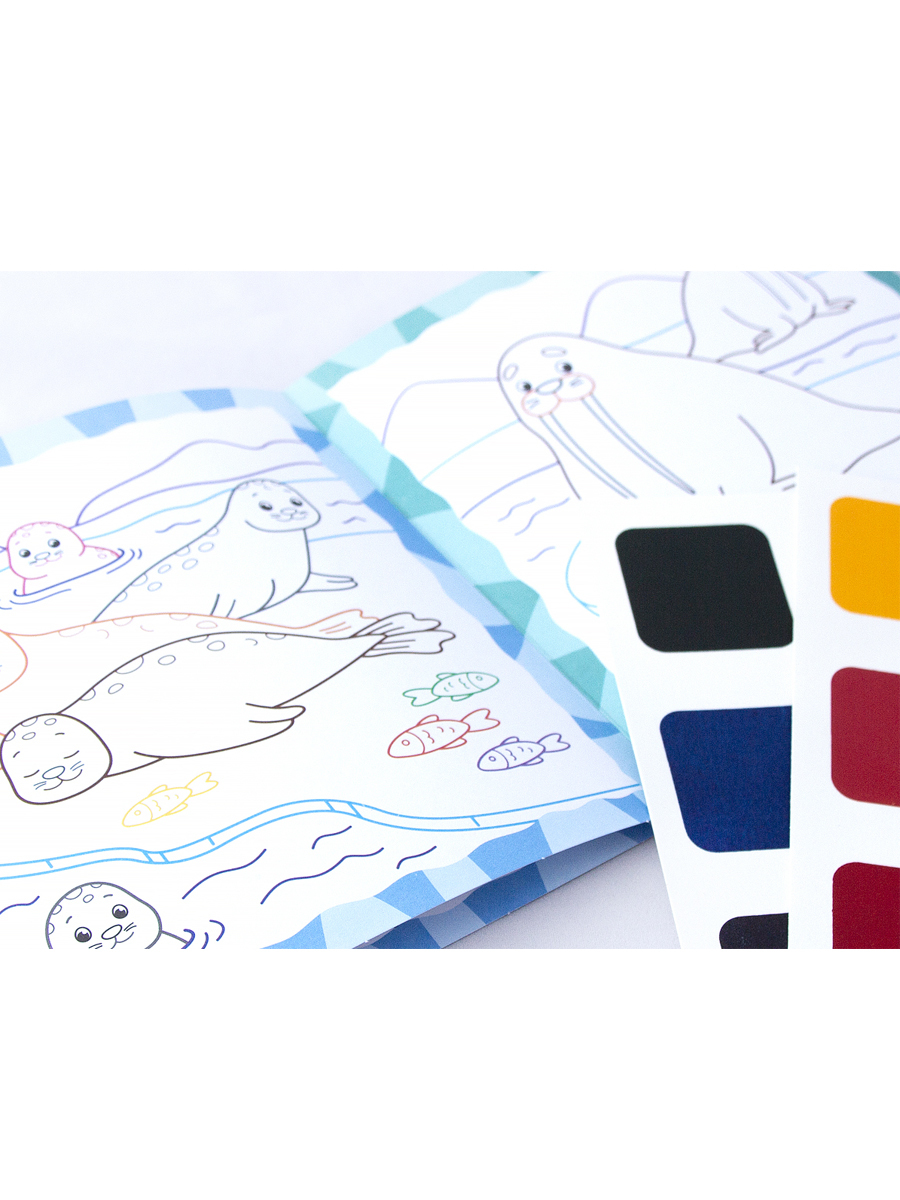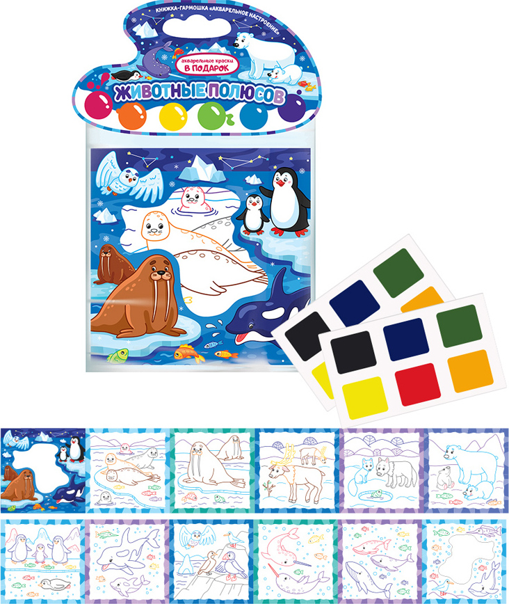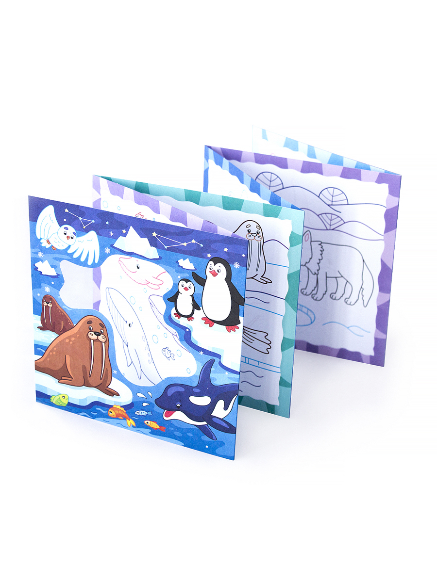 Гигантская раскраска-гармошка длиной 99 см увлекает вашего ребенка к холодным полюсам, где можно встретить белых медведей и пингвинов. А что, если сделать их цветными?Все рисунки выполнены широким разноцветным контуром и отлично подойдут для самых маленьк