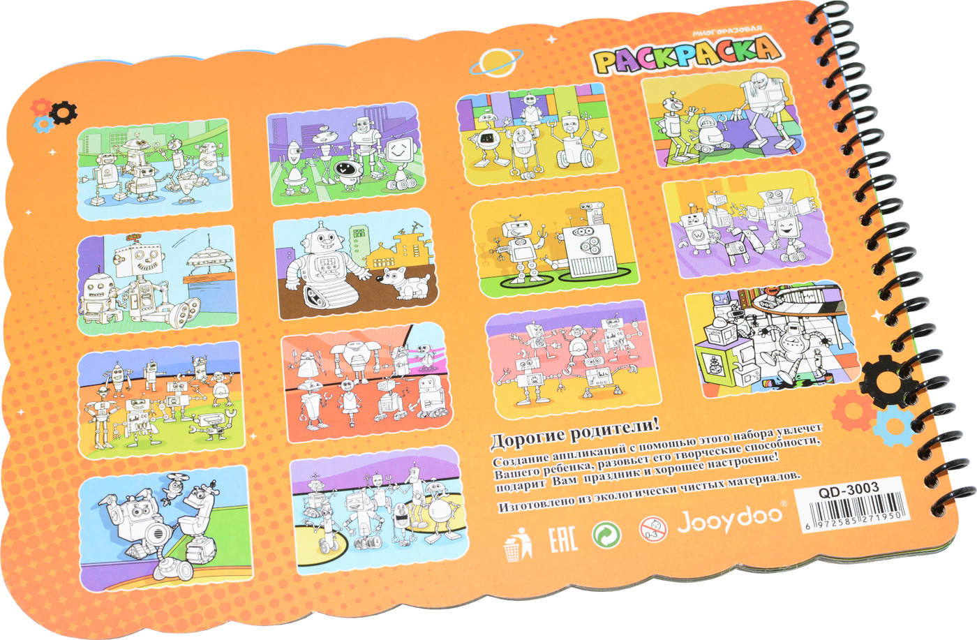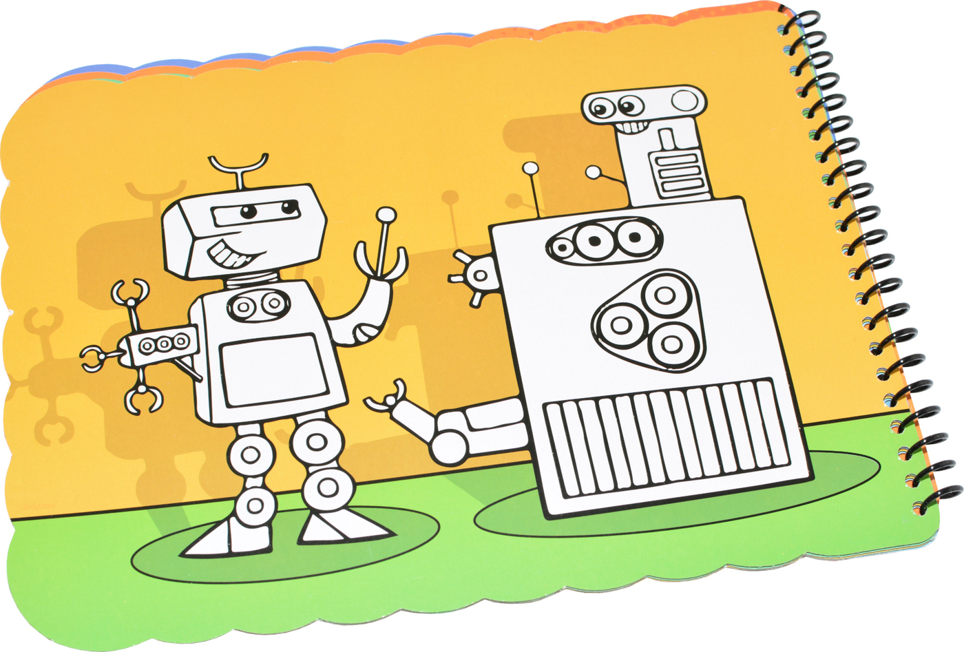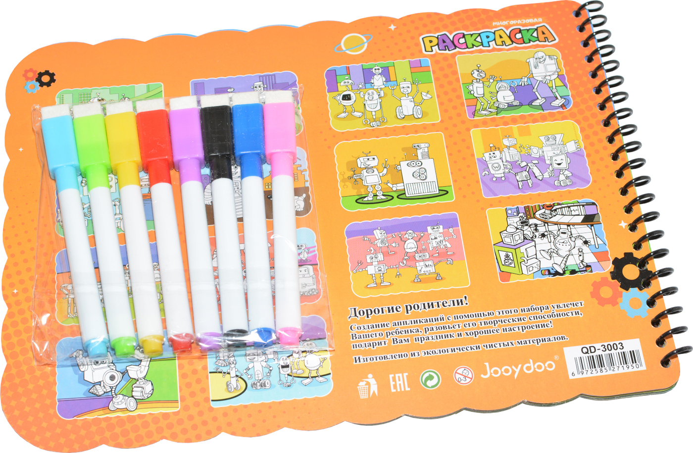 Многоразовая раскраска размером 260 мм х 188 мм из плотного ламинированного картона на пластиковом гребне. Всего 8 листов и 14 страниц с разными картинками для раскрашивания, объединёнными определённой темой. В комплекте с раскраской 8 разноцветных маркер