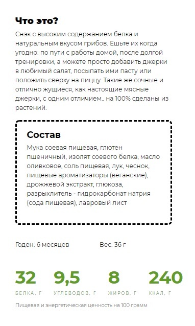Особенности напитков, продуктов питанияВегетарианский продукт, Постный продукт, Высокое содержание белка, Диетический продукт, Считаем калории