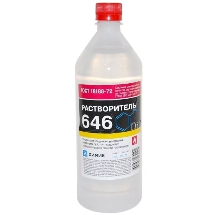 Растворитель 646 предназначен для разбавления нитроэмалей, нитролаков и нитрошпатлевок общего назначения.Также используется для доведения до рабочей вязкости глифталевых, эпоксидных грунтовок и очистки малярного инструмента.