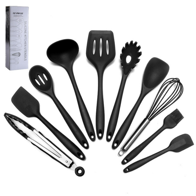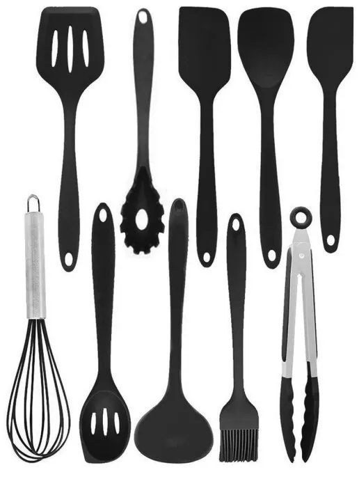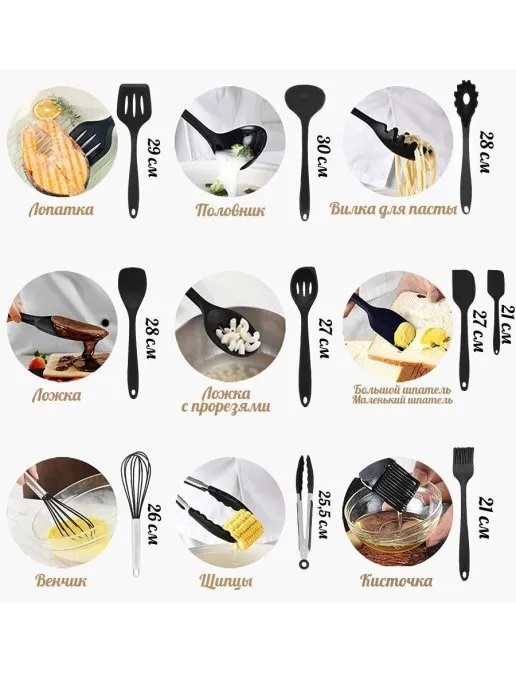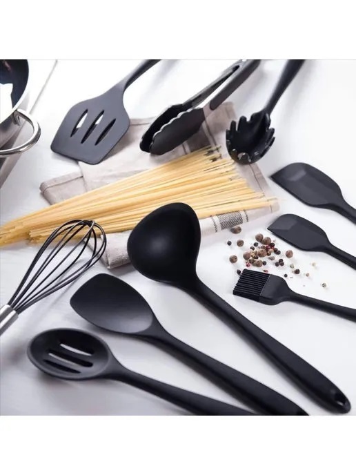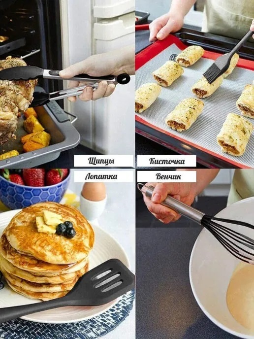 Комплектация:Половник, ложка с отверстиями, ложка для соусов, ложка для пасты с отверстием, лопатка с отверстиями, лопатки со скошенным краем, кисточка, венчик, щипцы.Описание:Кухонный набор РАТАТУЙ включает в себя 10 предметов из жаростойкого силикона. Н