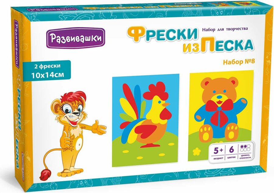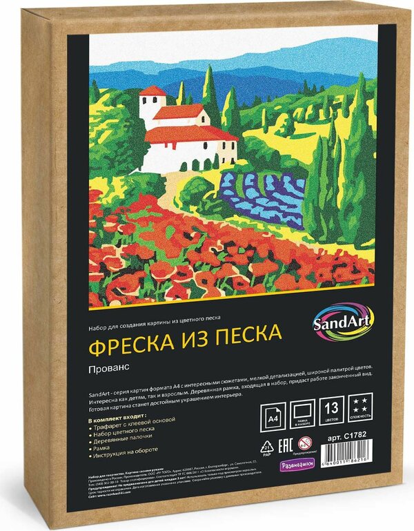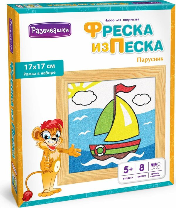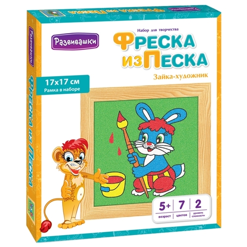 Дополнительная информацияв наборе трафарет с клеевой основой, цветной песок, картонная рамка, деревянная палочка; размеры рамки 17 х 17 см; размеры картинки 14.5 х 14.5 см