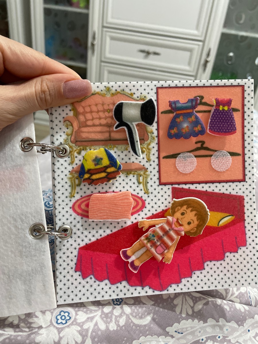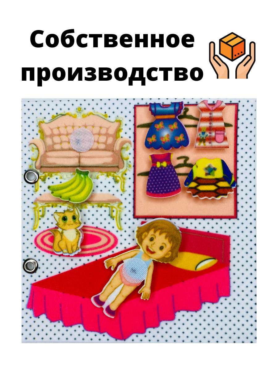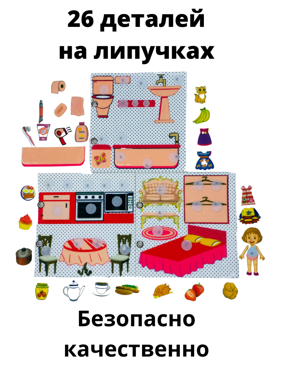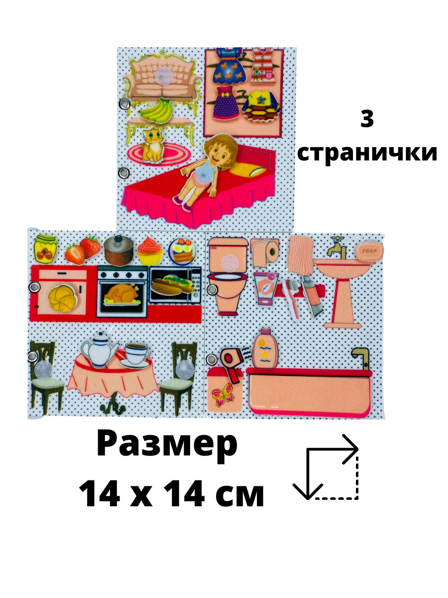 Мягкая книжка из фетра на липучках "Кукольный домик". Серия "Малыши-Умняши"Живет в небольшом, симпатичном домике милая девочка. Она очень любит готовить вкусную еду, примерять красивые наряды и играть со своей кошечкой.Книжка содержит 3 игровые странички