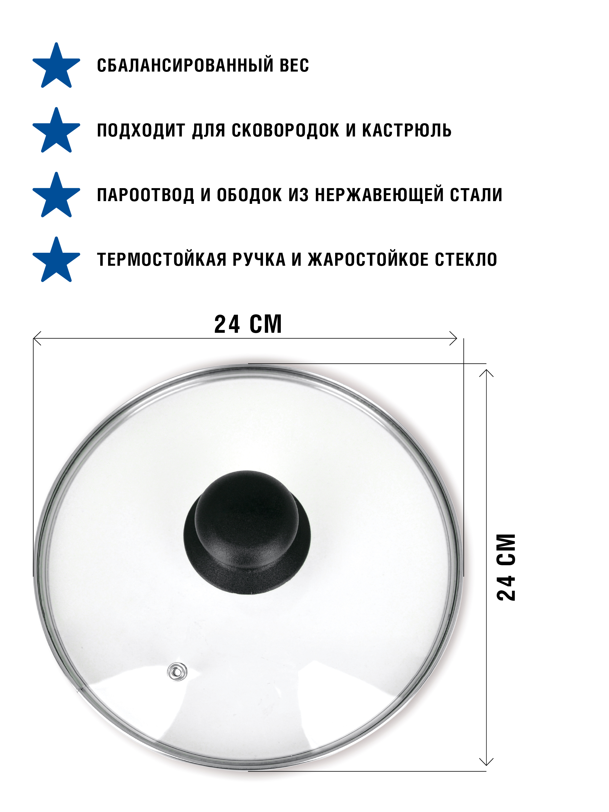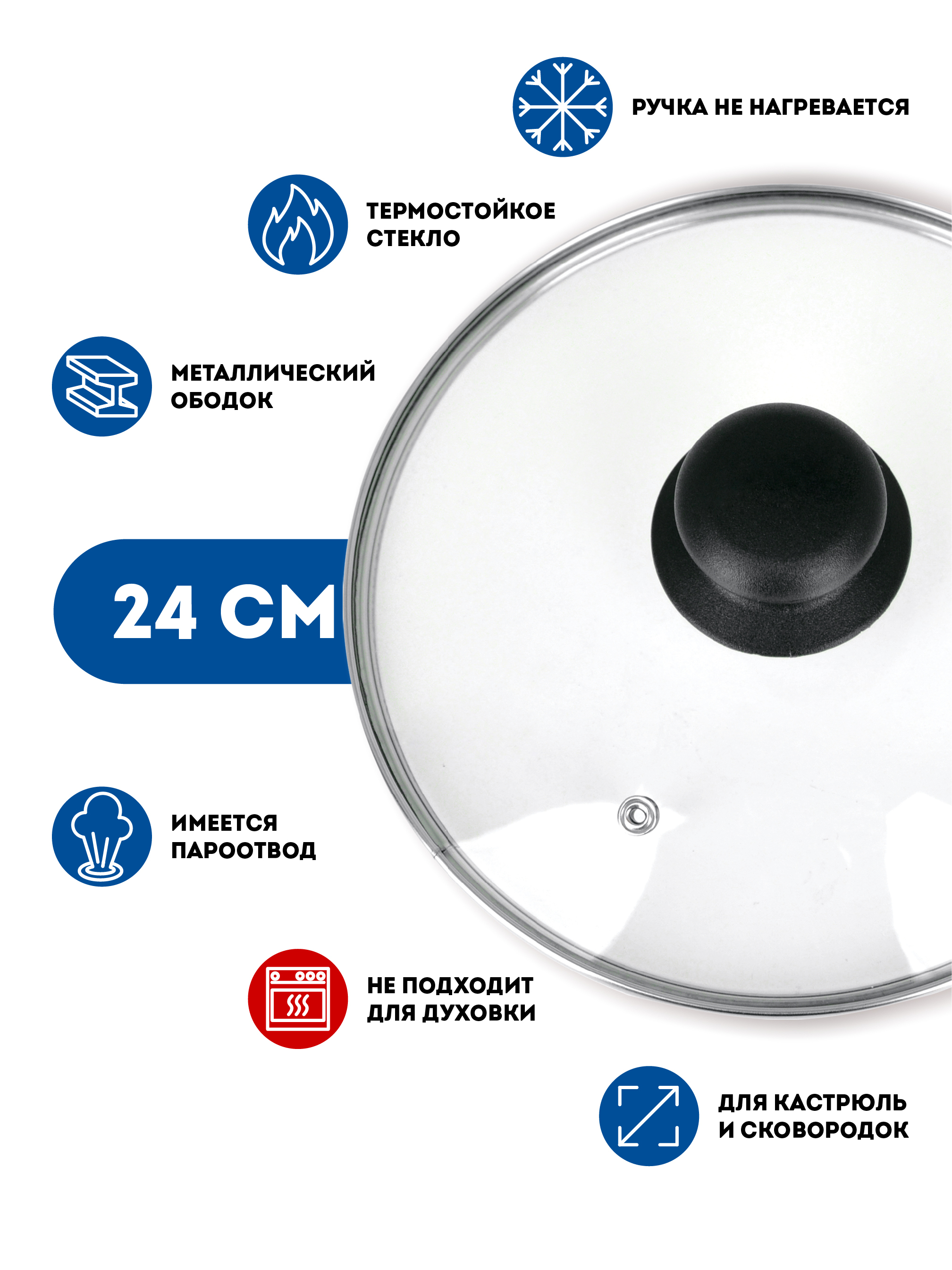 Комплектация:Универсальная стеклянная крышка - 24 смОписание:Универсальная стеклянная крышка диаметром 32 см с ручкой из пластика подходит для любой посуды соответствующего размера. Крышка изготовлена из закаленного стекла с отверстием для выпуска пара,чт