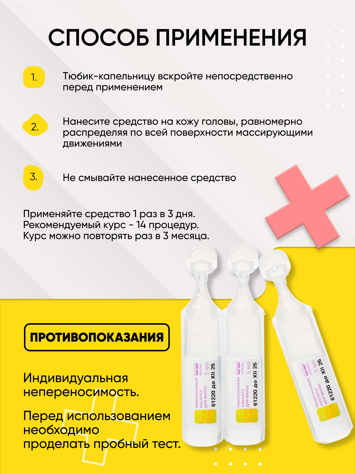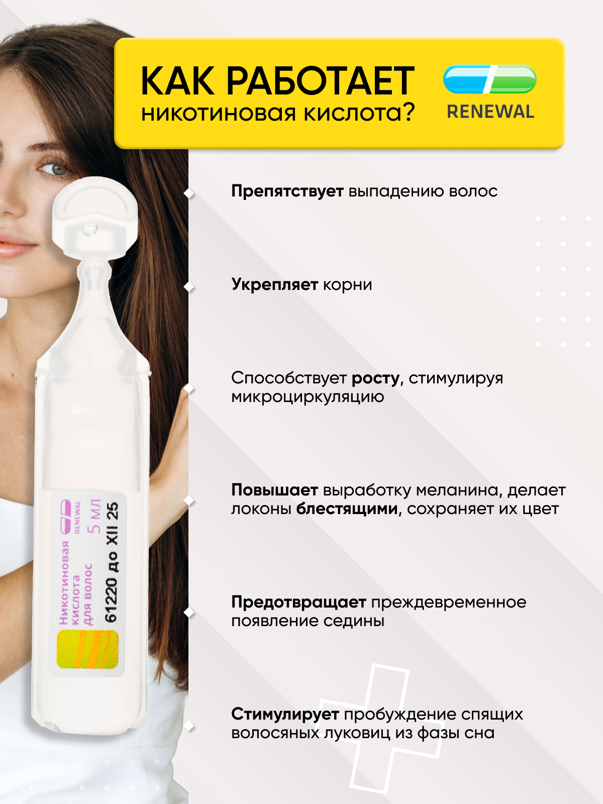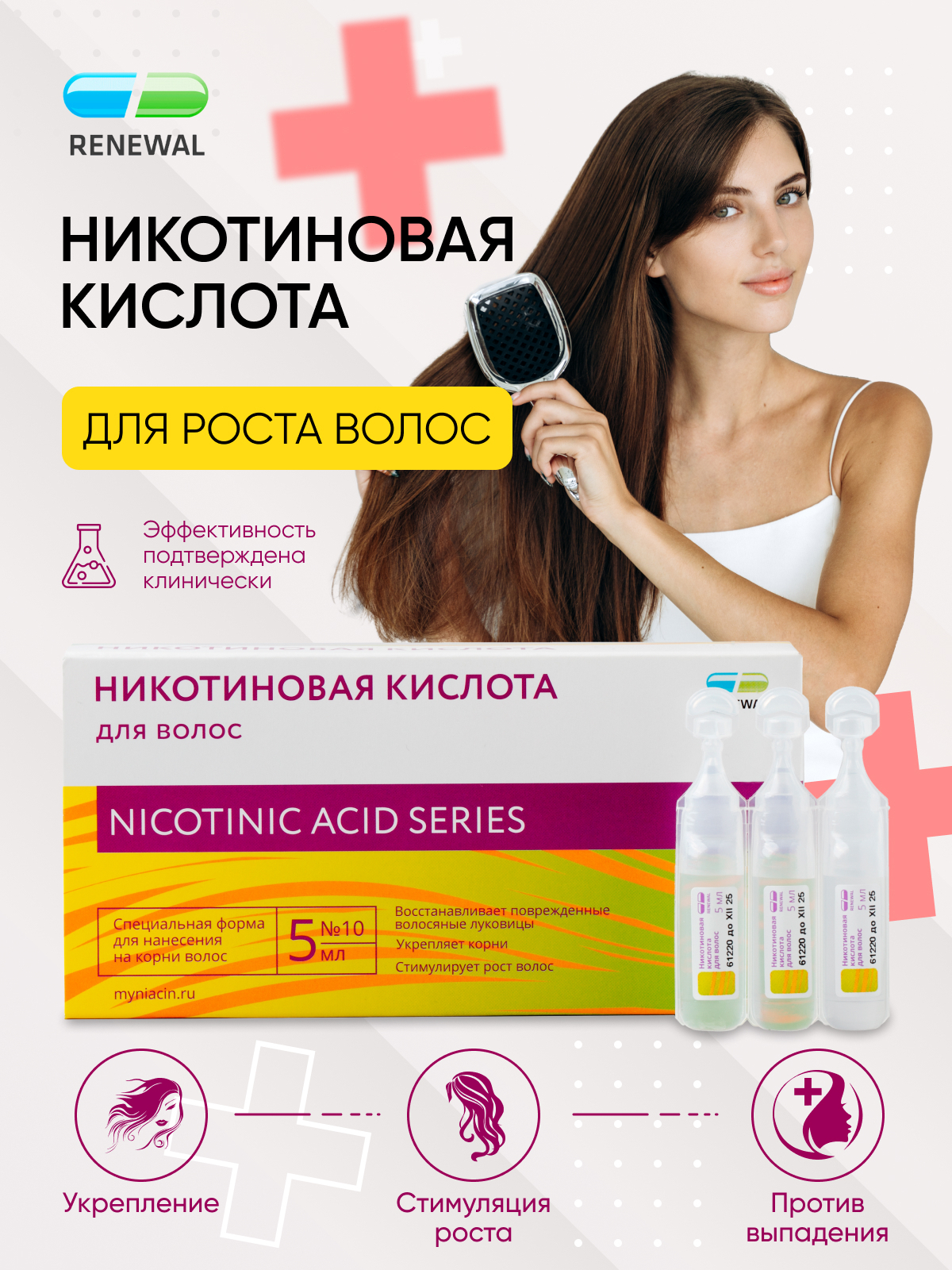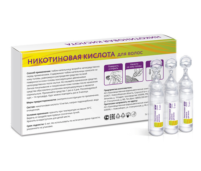 Никотиновая кислота это средство для роста волос.Является витамином (Pp,B3) для волос от выпадения.При нанесении на кожу головы никотиновая кислота (витамины в ампулах) расширяет периферические кровеносные сосуды, усиливает кровообращение, улучшает трансп