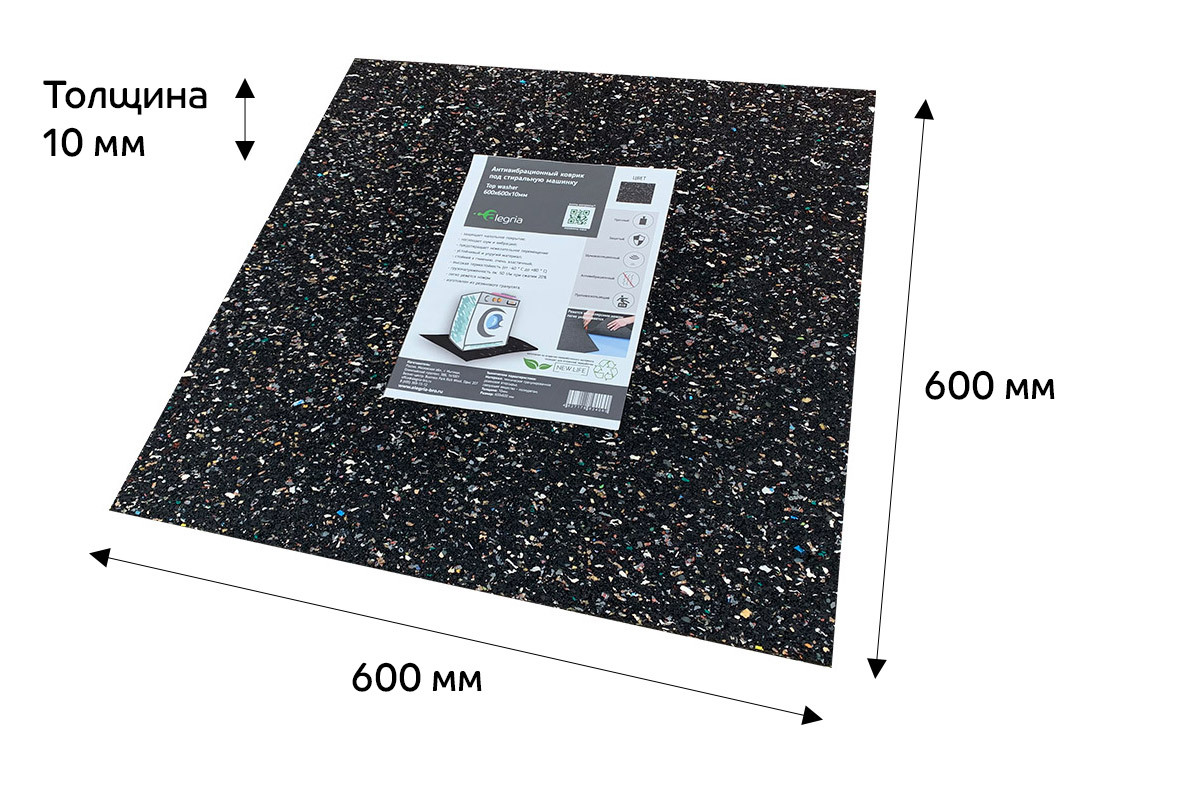 Антивибрационный защитный коврик из резинового вторсырья, связанный полиуретаном.Обладает хорошей износостойкостью, выдерживает высокие нагрузки. Поглощает вибрацию стиральной или сушильной машины, снижая шум. Обеспечивает амортизацию и защищает пол от ца