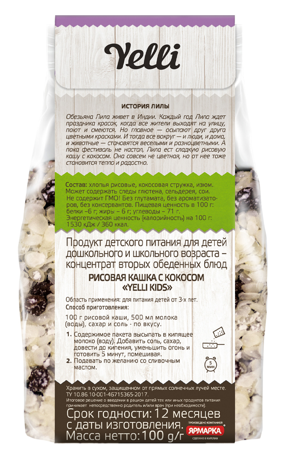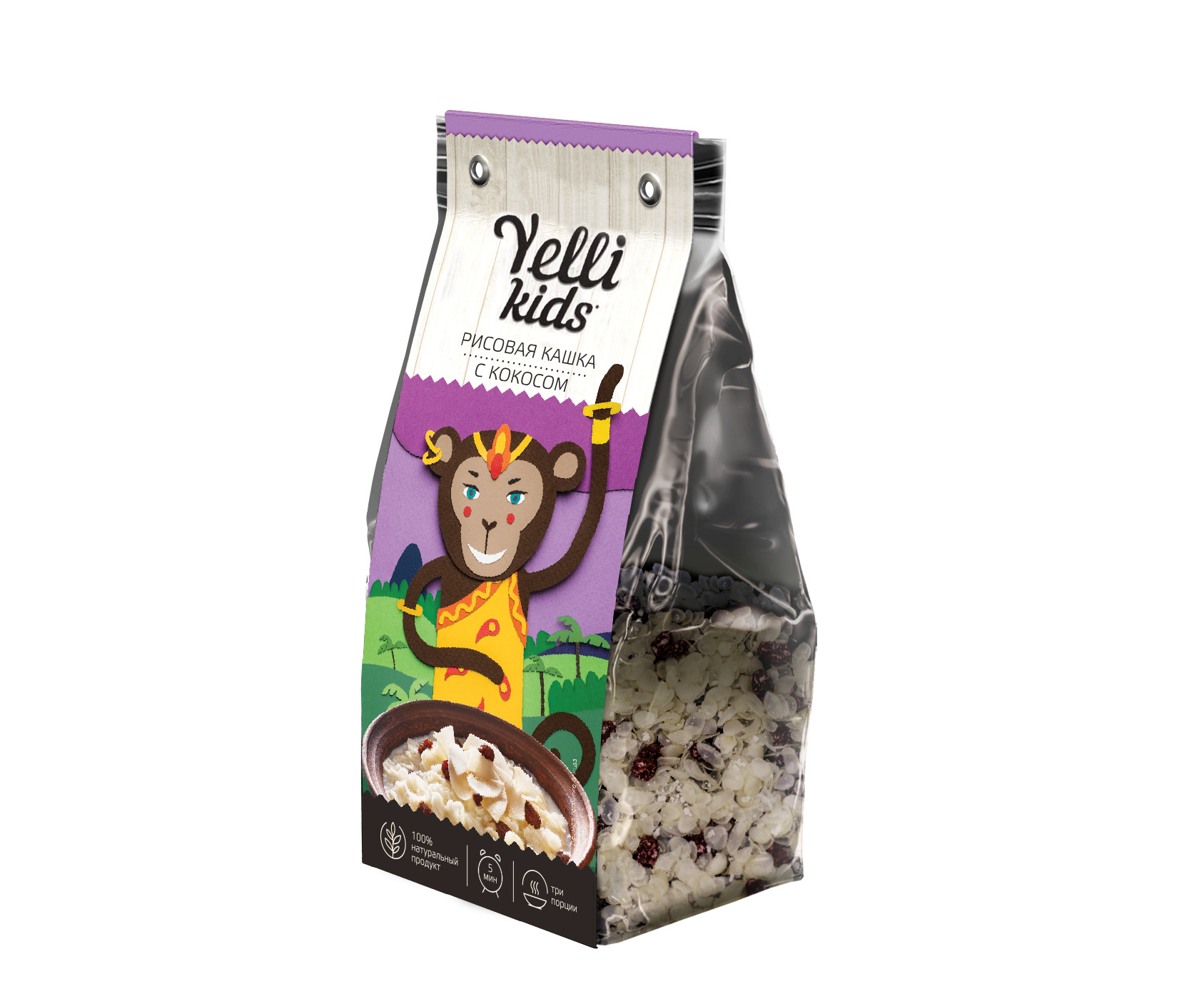 Наши дети - это маленькие исследователи. Мы хотим, чтобы они былиздоровы, радовались жизни, делали новые открытия! Yelli Kids помогаетоткрывать новые вкусы, заботится о здоровье малышей и экономит времяродителей.Состав:хлопья рисовые, изюм, кокосовая стру