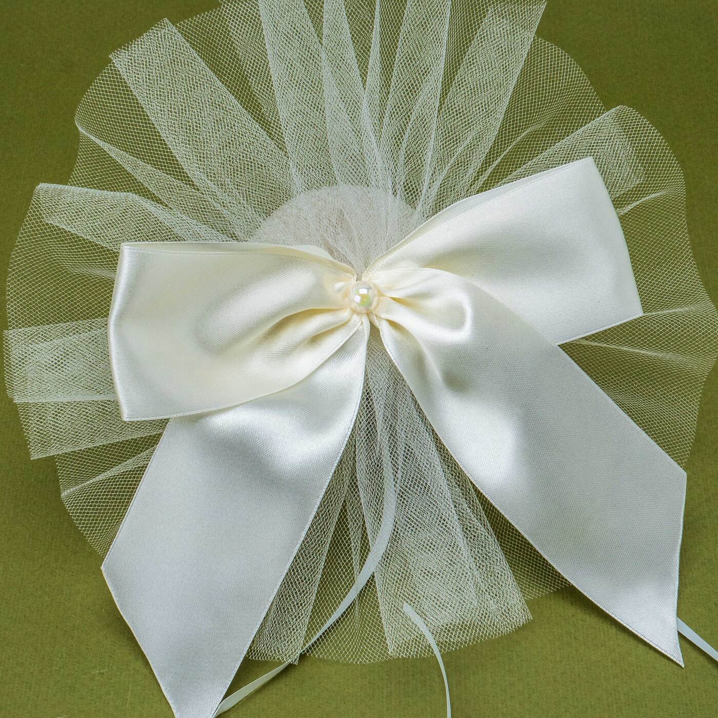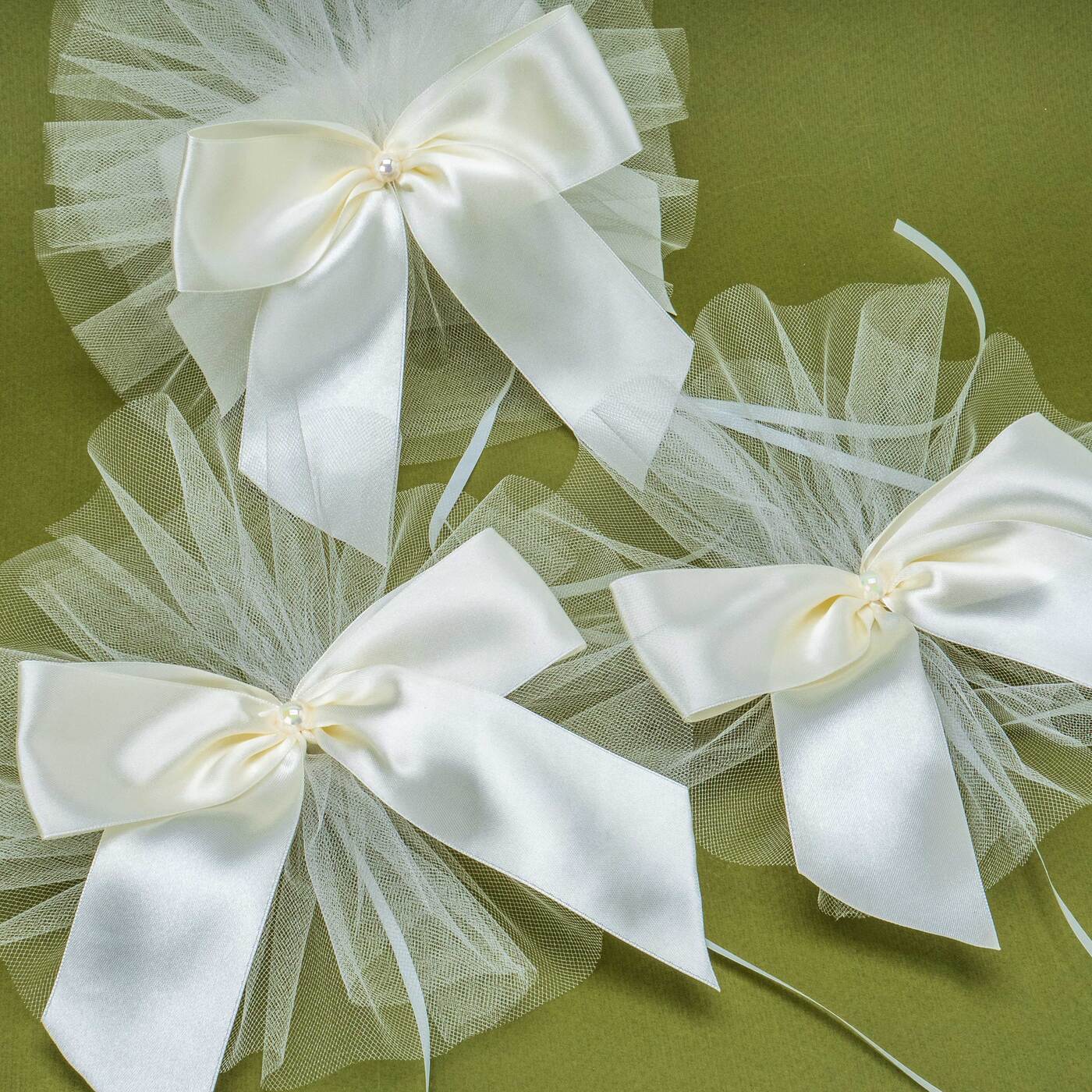 Комплектация:4 бантаОписание:Комплект бантов на машину цвета айвори ручной работы состоит из 4-х воздушных украшений. Банты расположены на фатине, выполнены из атласных лент, украшены декоративными перламутровыми сердечками. Комплект украшений украсит руч