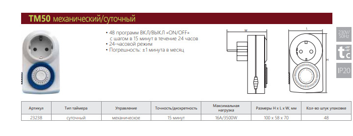 Комплектация:Розетка с таймером - 1 шт.Описание:Суточная механическая розетка-таймер рассчитана на подключение электроприборов общей мощностью до 3500W. Если Вы хотите включить обогреватель перед сном, но хотите, чтобы через час он выключился, то данная р