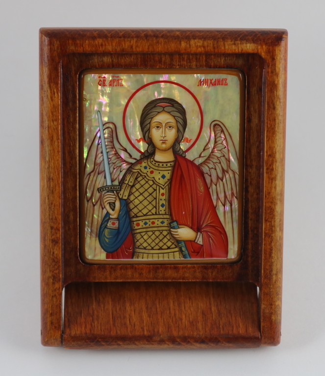 Ручная роспись темперными красками по натуральному перламутру, сусальное золото, лак.Складень изготовлен из бука с применением тонировки, покрыт защитным слоем лака. Размер 9*7 см позволяет взять его с собой, либо разместить дома. Упаковываем в бархатный