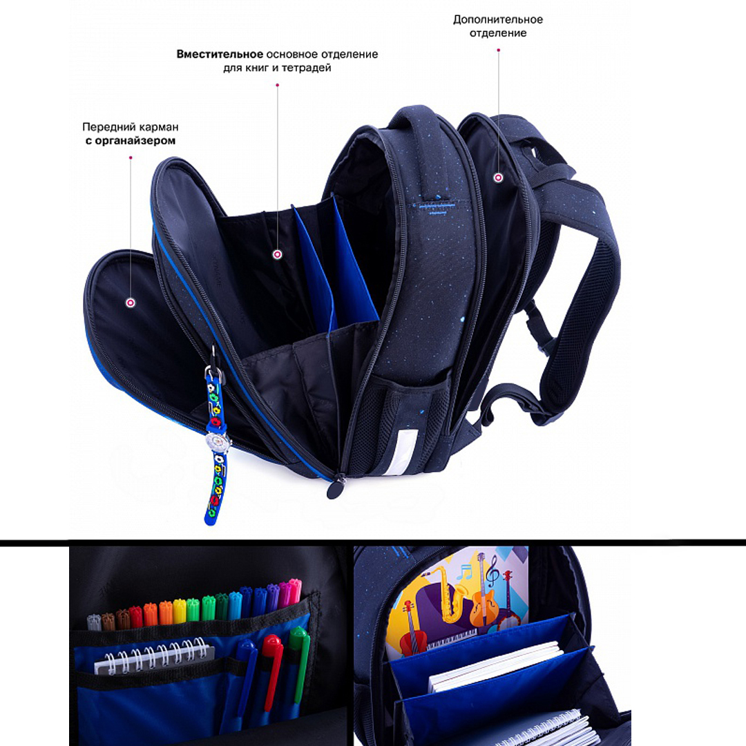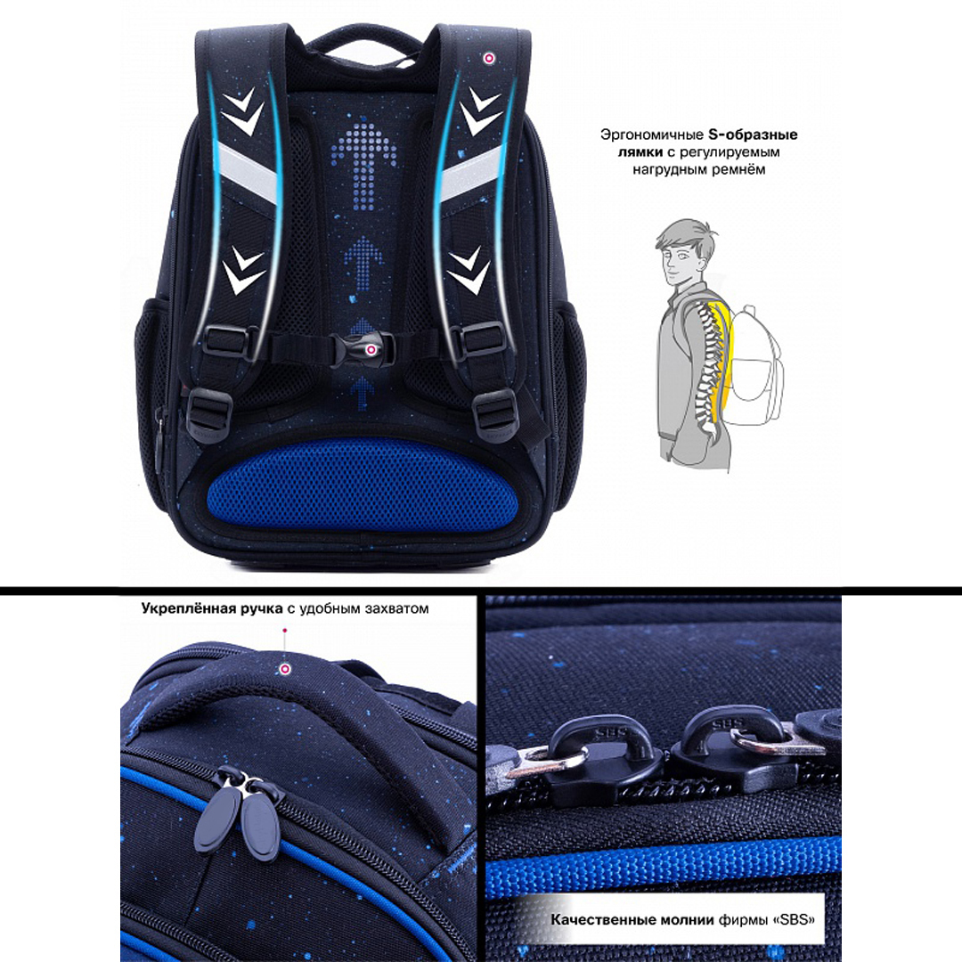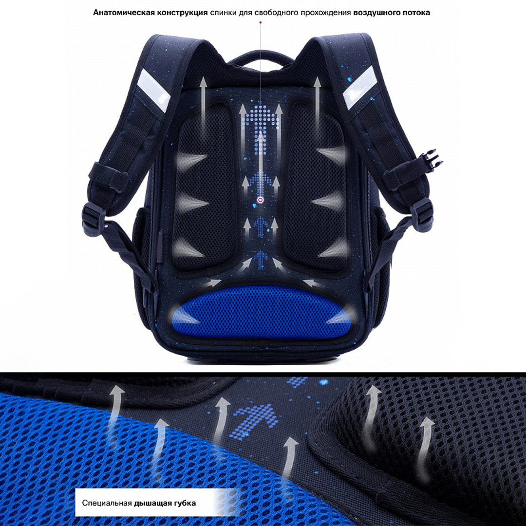 Особенности конструкции сумкиОртопедическая спинка, Светоотражающие вставки, Анатомические лямки, Воздухопроницаемая спинка, Пластиковые ножки, Органайзер для принадлежностей, Вентилируемые лямки, Влагонепроницаемый, Для первоклассника, Жесткое дно, Разделитель в главном отделении, Регулируемый грудной ремень, Грудная стяжка, Эргономичная ручка для переноски