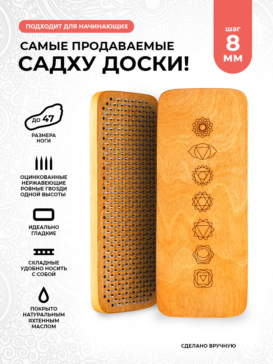 Комплектация:Доска садху для йоги - 2 шт.Описание:640 оцинкованных гвоздей.Доска Садху - это приспособление в форме доски с вертикально вбитыми в нее гвоздями, размещенными вверх остриями.Практика лежания и стояния на острых гвоздях зародилась в среде дре