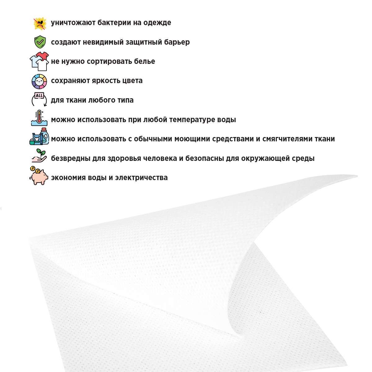 Необходимы для стирки белого и цветного белья одновременно, препятствуют окрашиванию вещей, притягивая полинявший цвет на себя. Антибактериальные компоненты помогут справиться с микробами и бактериями, а также создать невидимый защитный барьер.Комплектаци