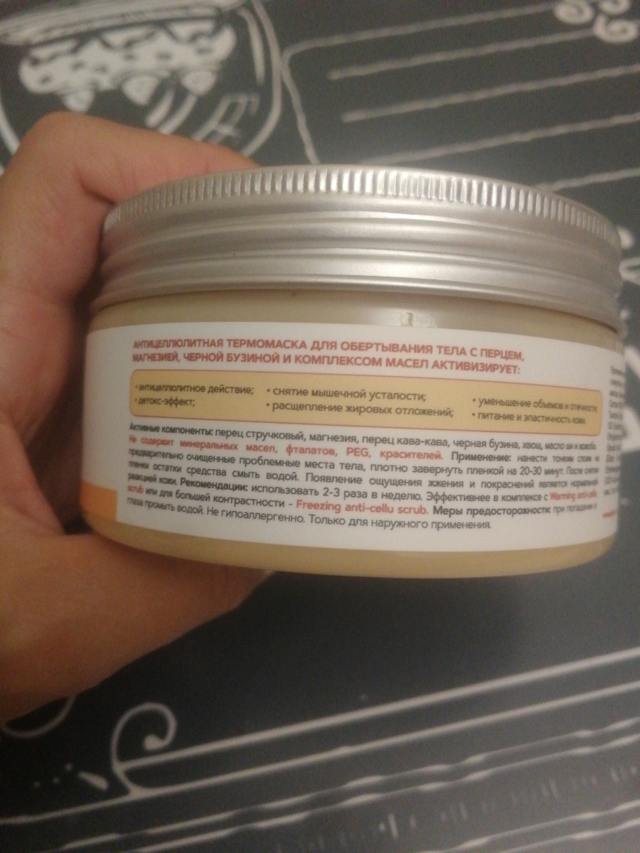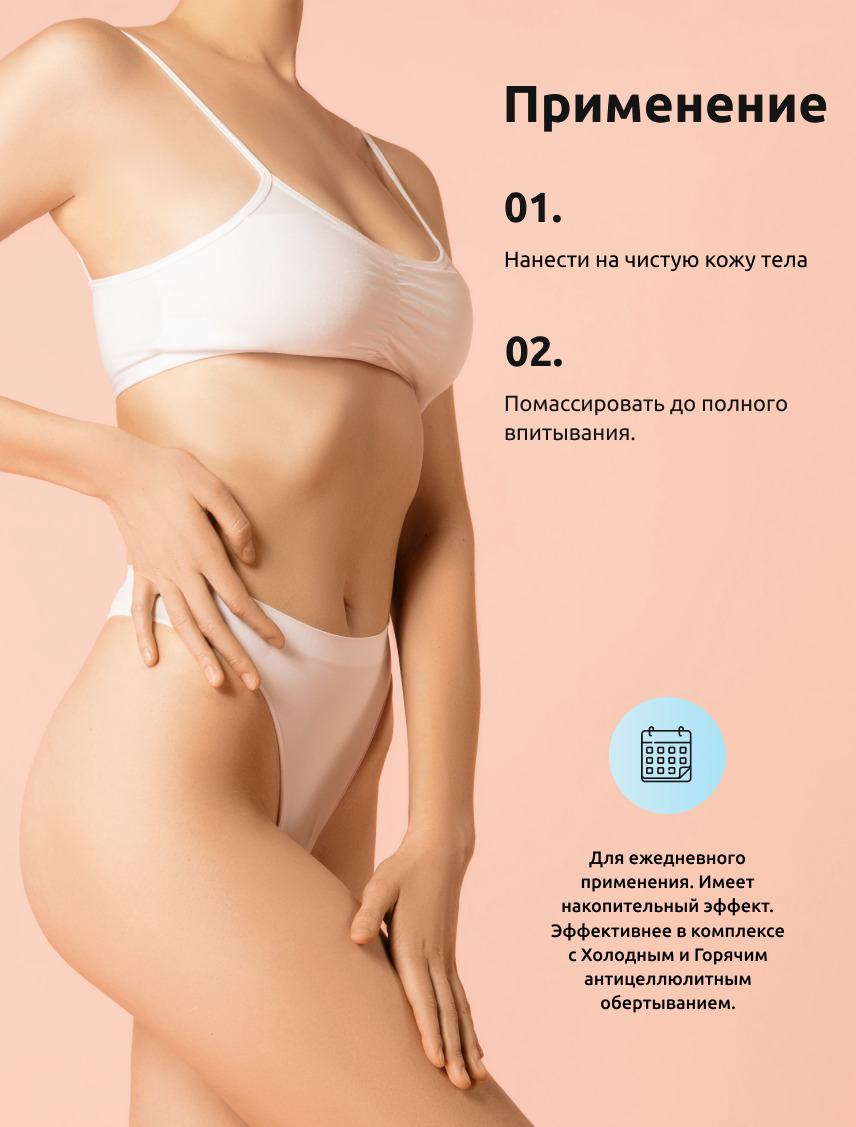 Способ примененияНанести на чистую кожу тела, помассировать до полного впитывания. Рекомендации: для ежедневного применения. Имеет накопительный эффект. Рекомендован при варикозе. Эффективнее в комплексе с "Холодный скраб" и "Горячий скраб" Противопоказания: индивидуа