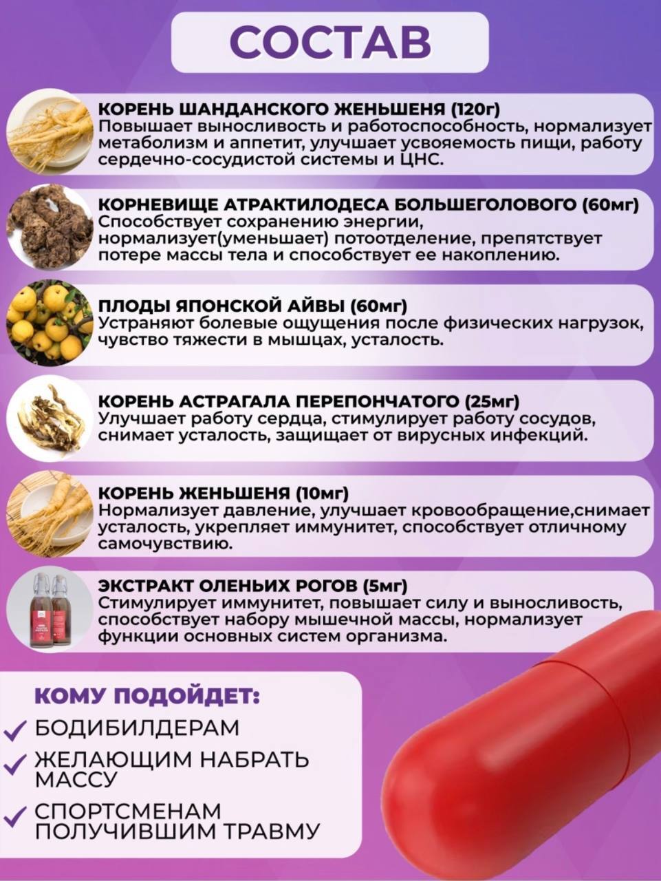 Составженьшень 20%, желатиновая капсула 2%, Корень Астрагала перепончатого 19%, экстракт рогов оленя 20%, корневище атрактилодеса большеголового 19%, Плоды Японской айвы 20%