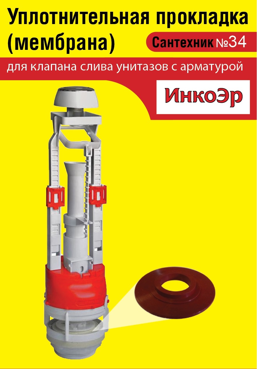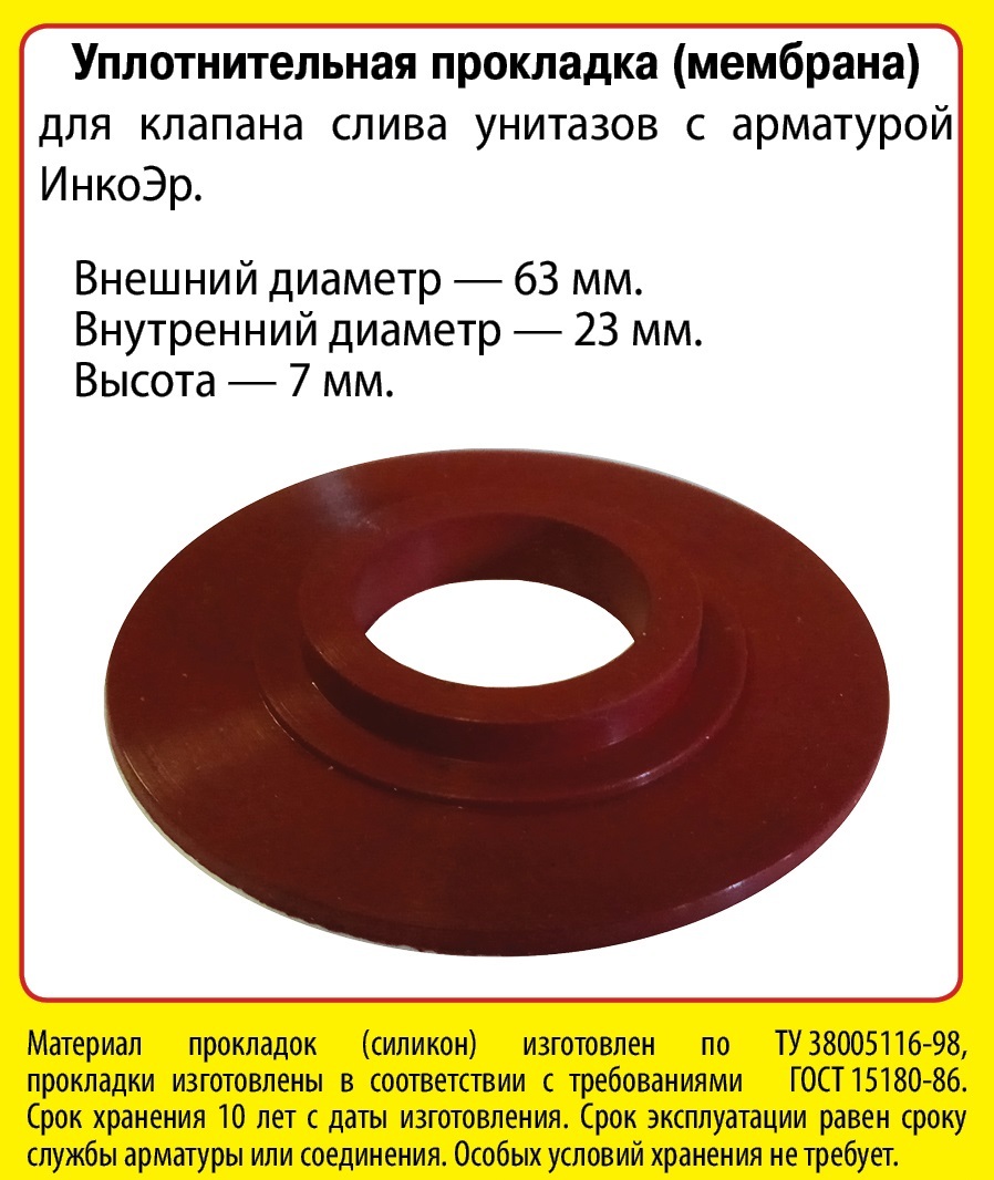 Уплотнительная прокладка (мембрана) для клапана слива унитазов с арматурой Инкоэр.Материал прокладок (силикон) изготовлен по ТУ 38005116-98,прокадки изготовлены в соответствии с требованиями ГОСТ 15180-86.Срок эксплуатации равен сроку службы арматуры или