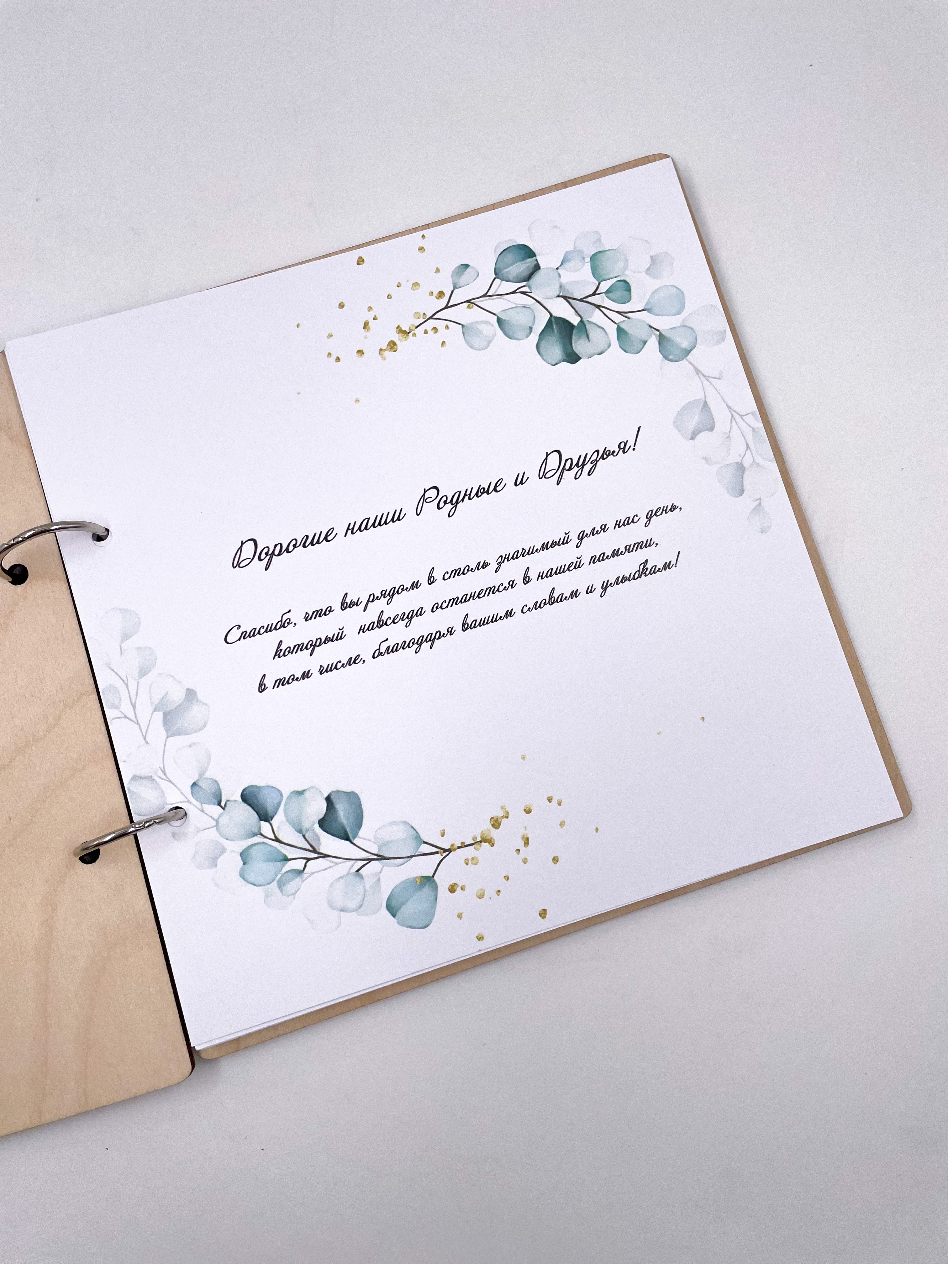 Комплектация:Размер книги: 210 на 210 ммРазмер листов: 200 на 200 ммВ книгу входят 30 листов плотной, белой бумаги. Плотность бумаги 270 г/м2.И красивый первый приветственный лист. Описание:При заказе данного товара вы можете бесплатно добавить ваши имен