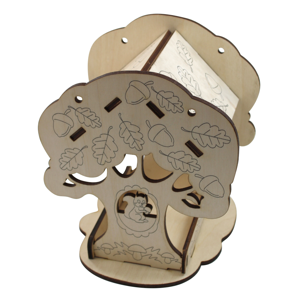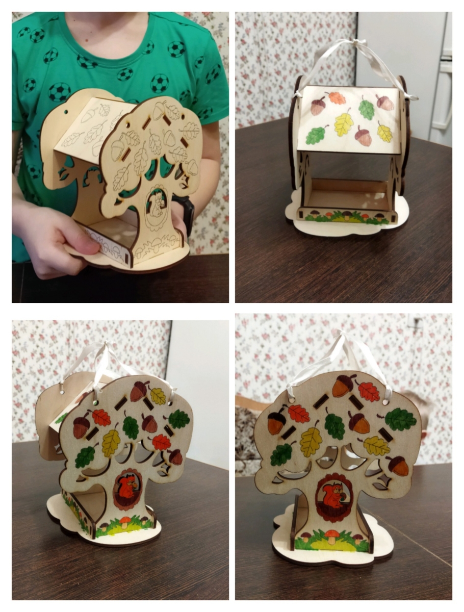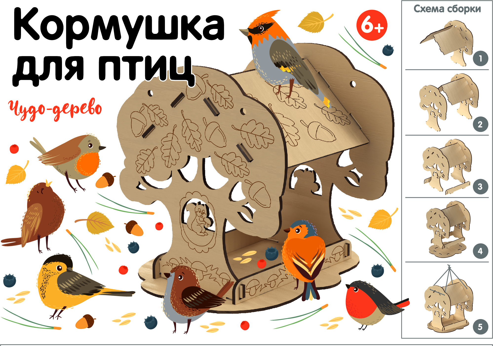 Сделайте доброе дело – соберите кормушку для птиц! Состав: • боковые стенки (173 х 145 мм) – 2 шт. • дно (162х134 мм) – 1 шт. • элементы крыши (117 х 80 мм) – 2 шт. • боковые бортики (125 х 20 мм) – 2 шт. Размеры кормушки в собранном ви