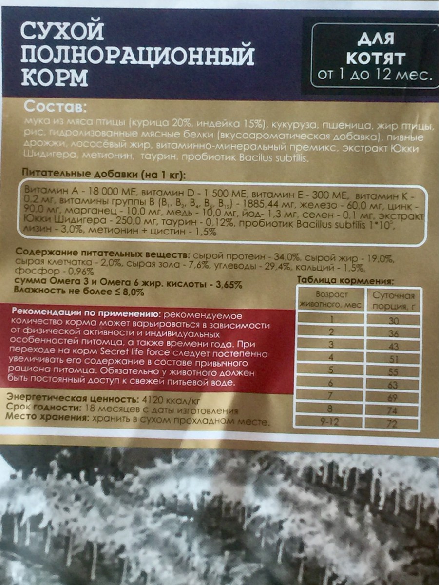 Состав:Мука из мыса птицы (курица - 20%, индейка - 15%), кукуруза, пшеница, жир птицы, рис, кукурузный глютен, гидролизованные мясные белки, пивные дрожжи, лососевый жир, витаминно-минеральный премикс, лизин, экстракт Юкки Шидигера, метионин, таурин, проб
