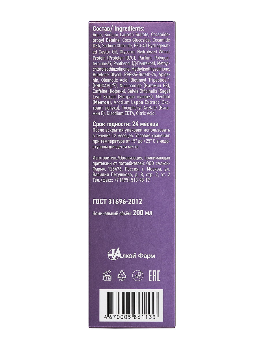Состав средства:Aqua, Sodium Laureth Sulfate, Cocamidopropyl Betaine, Coco-Glucoside, Cocamide DEA, Sodium Chloride, PEG-40 Hydrogenated Castor Oil, Glycerin, Parfum, Polyquaternium-67, Gryceryl Stearate (and) Cetearyl Alcohol (and) Stearic Acid (and) Sod