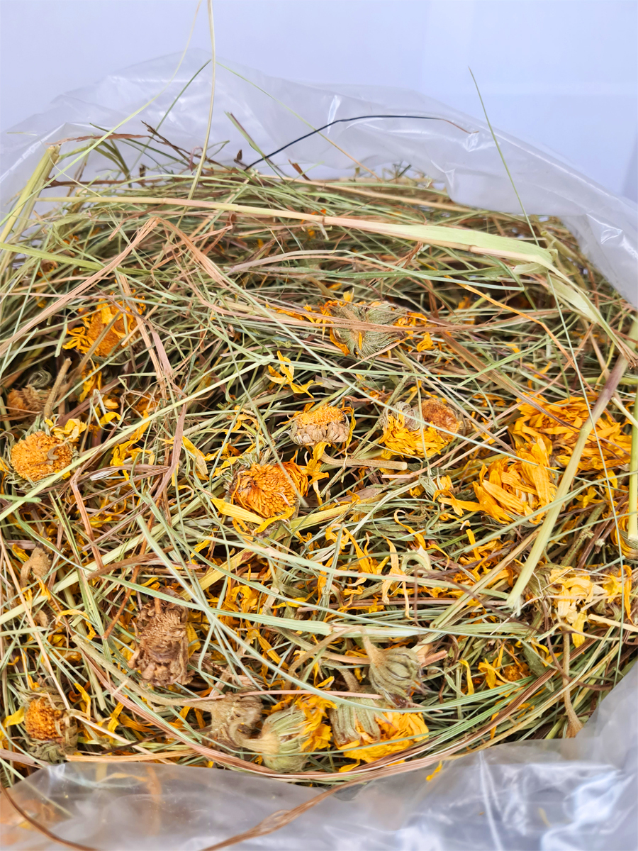 Цветки календулы содержат большое количество витамина С, каротиноидов и клетчатку, необходимых для обменных процессов и системы пищеварения животных. Сено является основной составляющей рациона всех травоядных животных (кроликов, морских свинок, шиншилл,