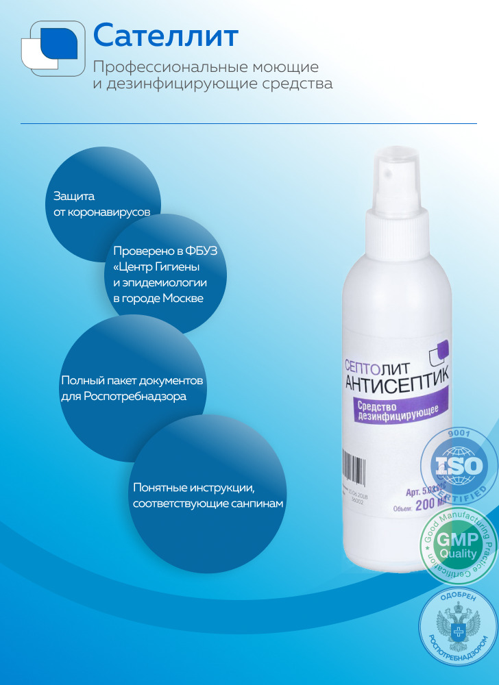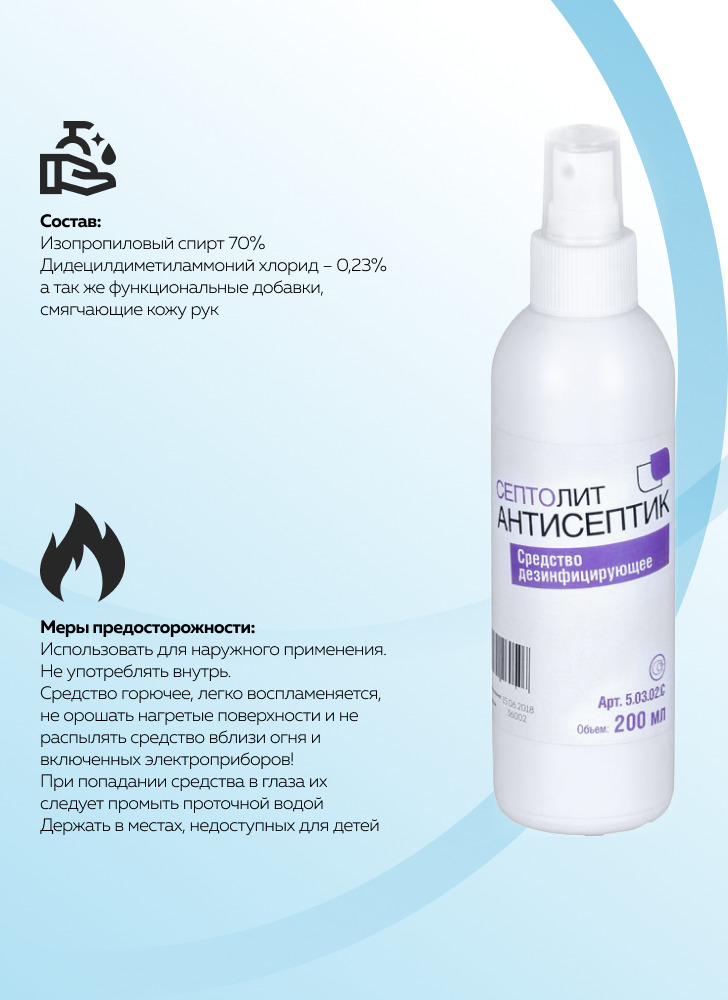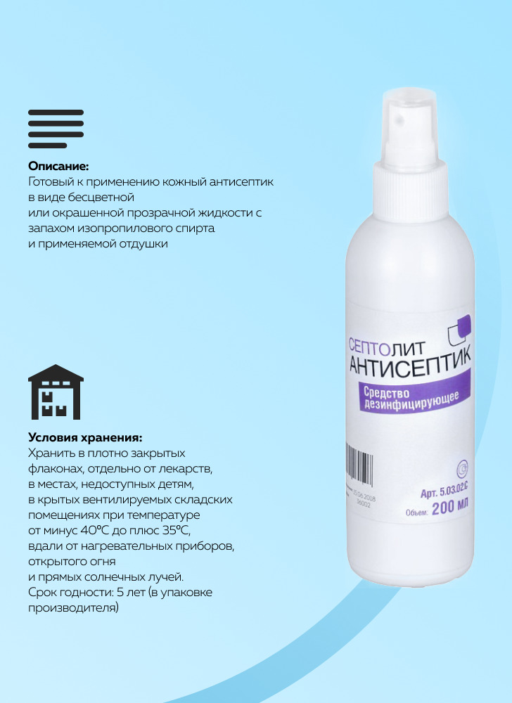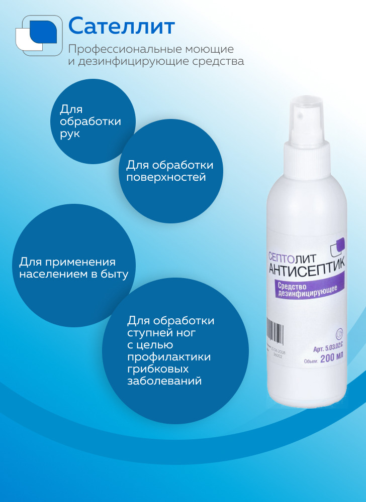 Способ применения:Применение дезинфицирующего средства Септолит-Антисептик:Предприятия общественного питания, Предприятия продовольственной торговли, Коммунальные объекты (бани, бассейны, гостиницы, общественные туалеты и т.п.), Учреждения соцобеспечения,