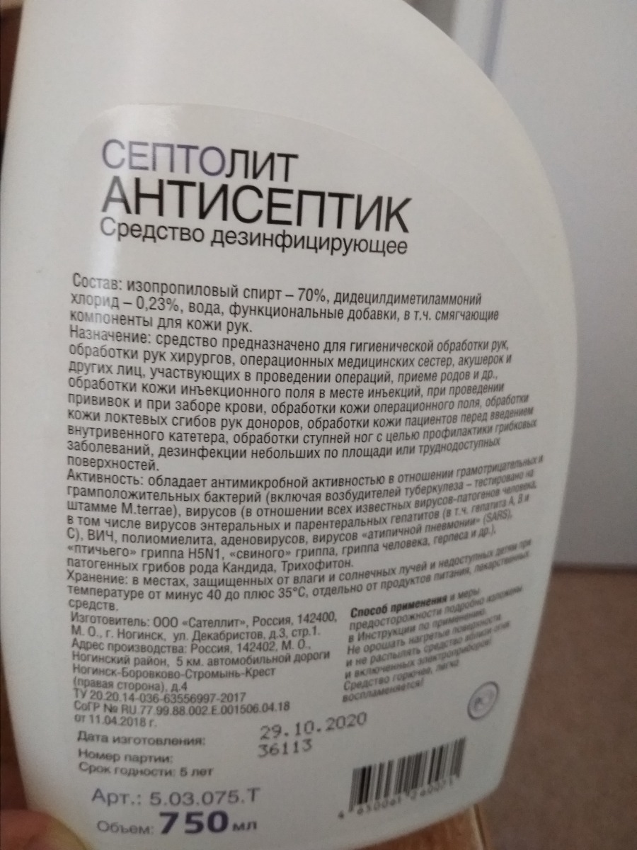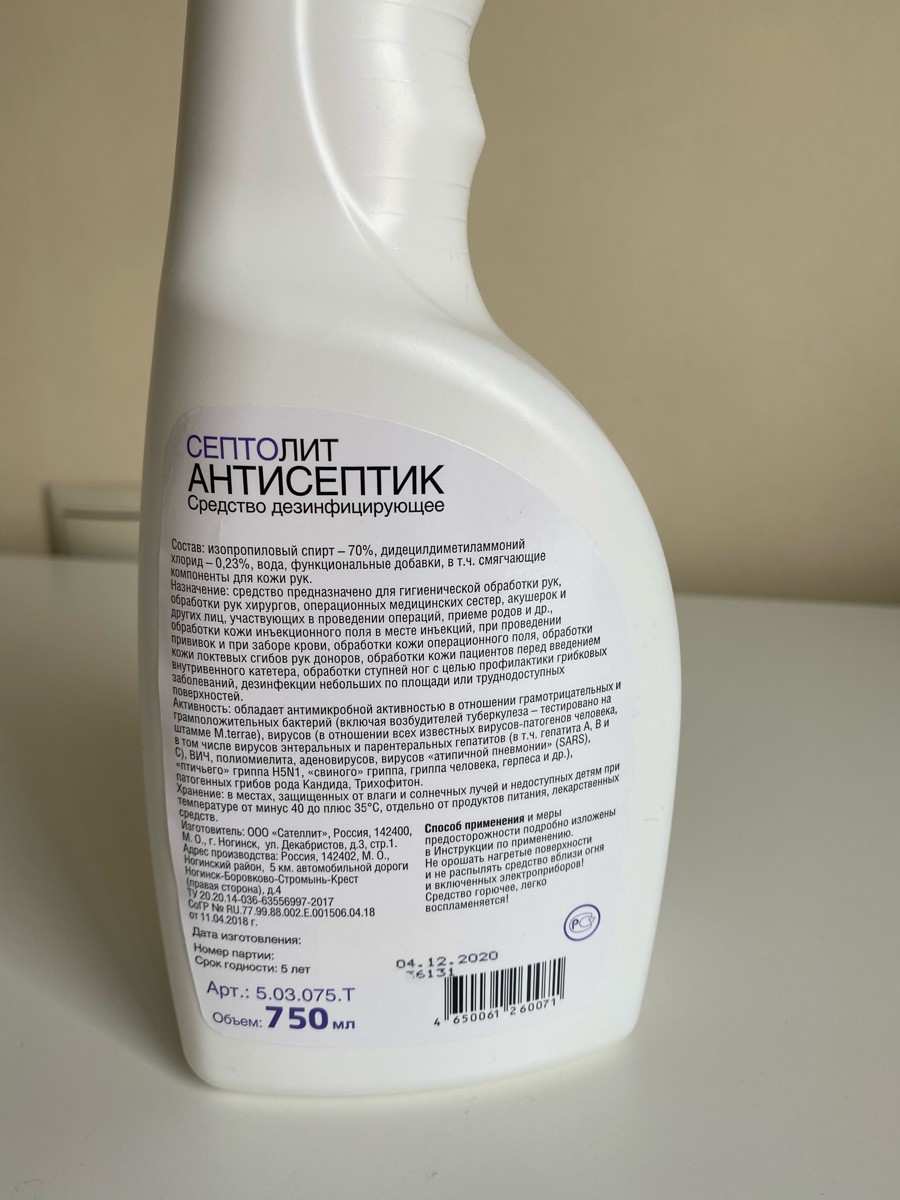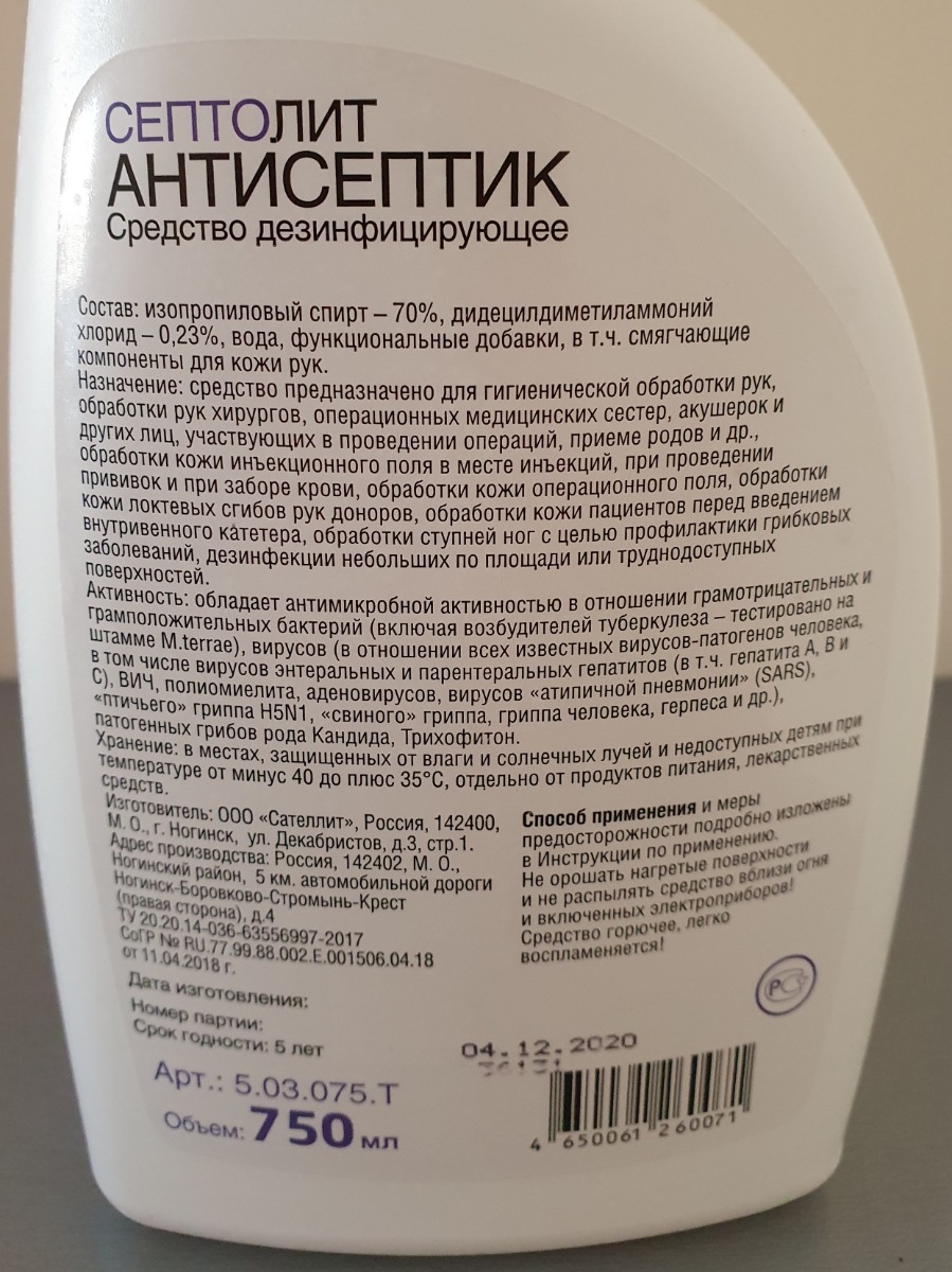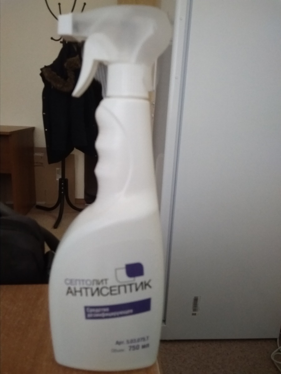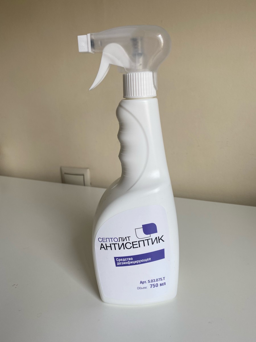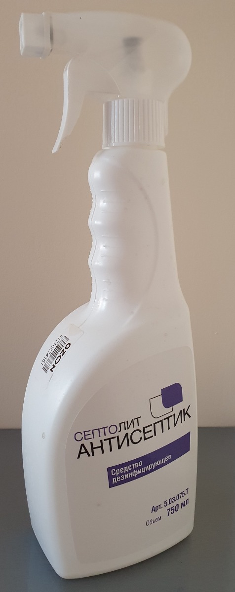 Состав средства:Изопропиловый спирт 70%, Дидецилдиметиламмоний хлорид 0,23%Описание:Назначение дезинфицирующего средства Септолит-Антисептик:дезинфекции небольших по площади или труднодоступных поверхностей в помещениях, поверхностей медицинских приборов