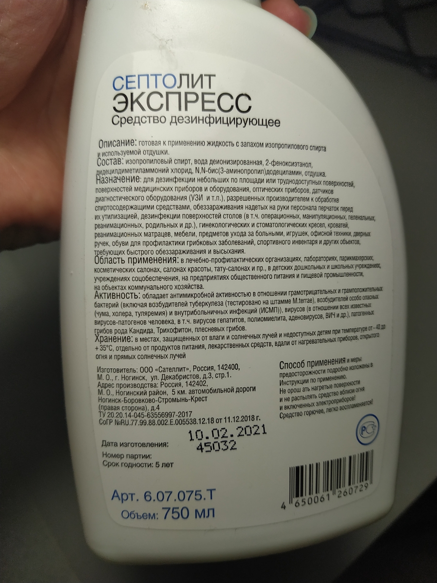 Состав средства:Изопропиловый спирт – 60%, дидецилдиметиламмоний хлорид – 0,2%, N,N-бис(3-аминопропил)додециламин - 0,2%, 2-феноксиэтанол – 0,3%, кроме того в состав средства входят отдушка и вода.Комплектация:выпускается во флаконах из полимерных материа